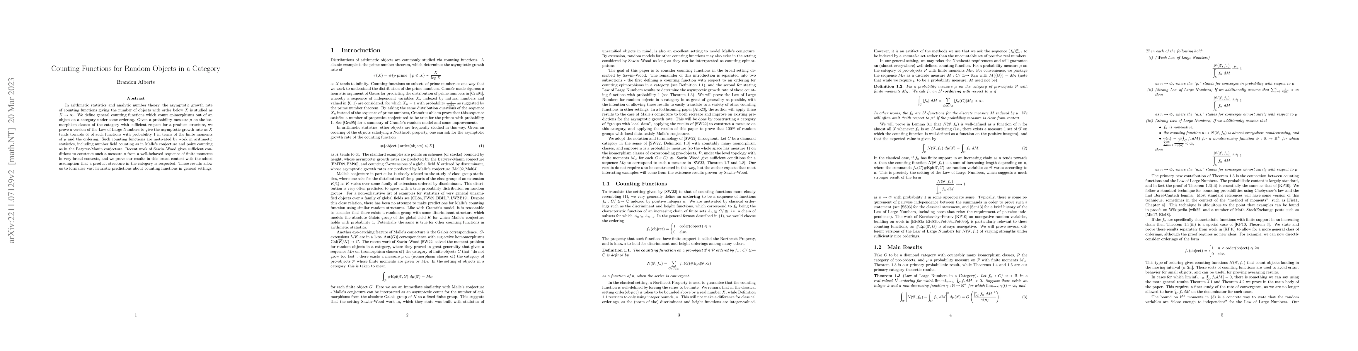 This paper studies the asymptotic growth rate of counting functions for objects in a category under an ordering, proving a Law of Large Numbers for these functions. It connects these results to arithmetic statistics, providing a framework for understanding counting functions in broad contexts, including number fields and point counting.