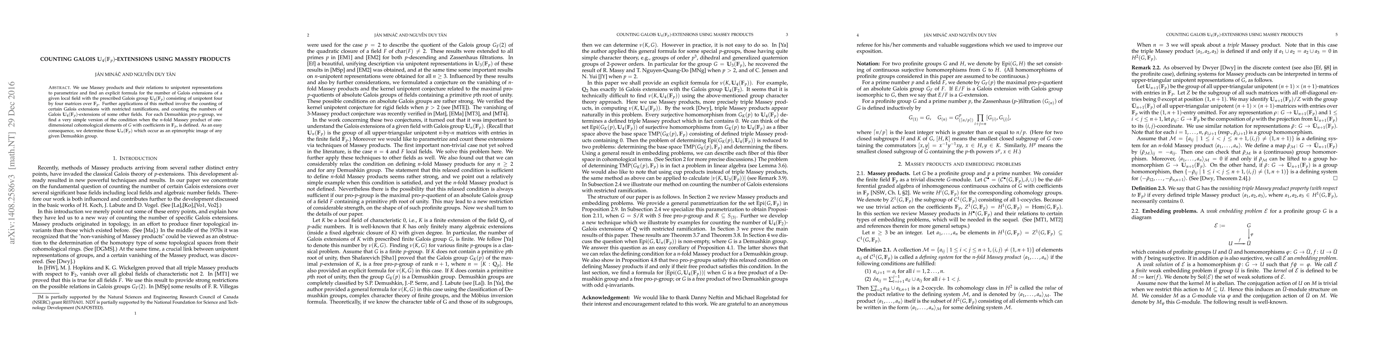 We use Massey products and their relations to unipotent representations to parametrize and find an explicit formula for the number of Galois extensions of a given local field with the prescribed Galois group ${\mathbb U}_4({\mathbb F}_p)$ consisting of unipotent four by four matrices over ${\mathbb F}_p$. Further applications of this method involve the counting of certain Galois extensions with restricted ramifications, and counting the numbers of Galois ${\mathbb U}_4({\mathbb F}_p)$-extensions of some other fields. For each Demushkin pro-$p$-group, we find a very simple version of the condition when the $n$-fold Massey product of one-dimensional cohomological elements of $G$ with coefficients in ${\mathbb F}_p$, is defined. As an easy consequence, we determine those ${\mathbb U}_n({\mathbb F}_p)$ which occur as an epimorphic image of any given Demushkin group.