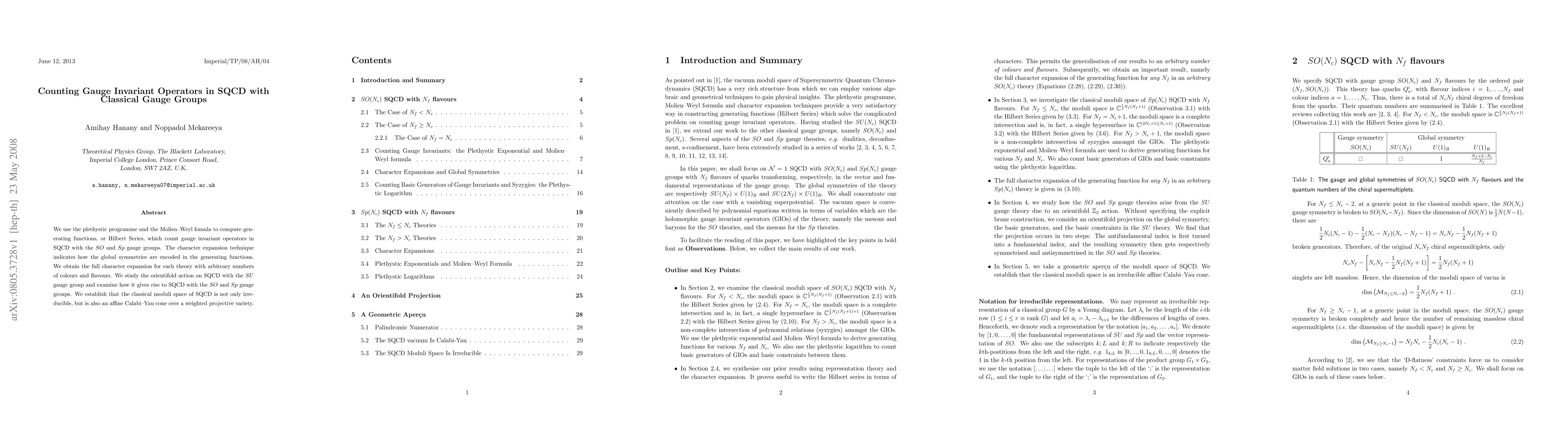 We use the plethystic programme and the Molien-Weyl fomula to compute generating functions, or Hilbert Series, which count gauge invariant operators in SQCD with the SO and Sp gauge groups. The character expansion technique indicates how the global symmetries are encoded in the generating functions. We obtain the full character expansion for each theory with arbitrary numbers of colours and flavours. We study the orientifold action on SQCD with the SU gauge group and examine how it gives rise to SQCD with the SO and Sp gauge groups. We establish that the classical moduli space of SQCD is not only irreducible, but is also an affine Calabi-Yau cone over a weighted projective variety.