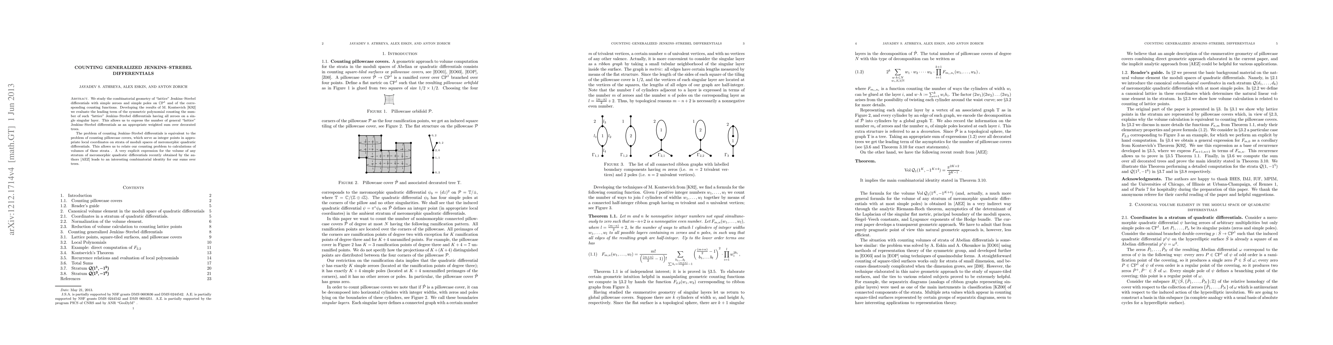 We study the combinatorial geometry of "lattice" Jenkins--Strebel differentials with simple zeroes and simple poles on $\mathbb{C}P^1$ and of the corresponding counting functions. Developing the results of M. Kontsevich we evaluate the leading term of the symmetric polynomial counting the number of such "lattice" Jenkins-Strebel differentials having all zeroes on a single singular layer. This allows us to express the number of general "lattice" Jenkins-Strebel differentials as an appropriate weighted sum over decorated trees. The problem of counting Jenkins-Strebel differentials is equivalent to the problem of counting pillowcase covers, which serve as integer points in appropriate local coordinates on strata of moduli spaces of meromorphic quadratic differentials. This allows us to relate our counting problem to calculations of volumes of these strata . A very explicit expression for the volume of any stratum of meromorphic quadratic differentials recently obtained by the authors leads to an interesting combinatorial identity for our sums over trees.