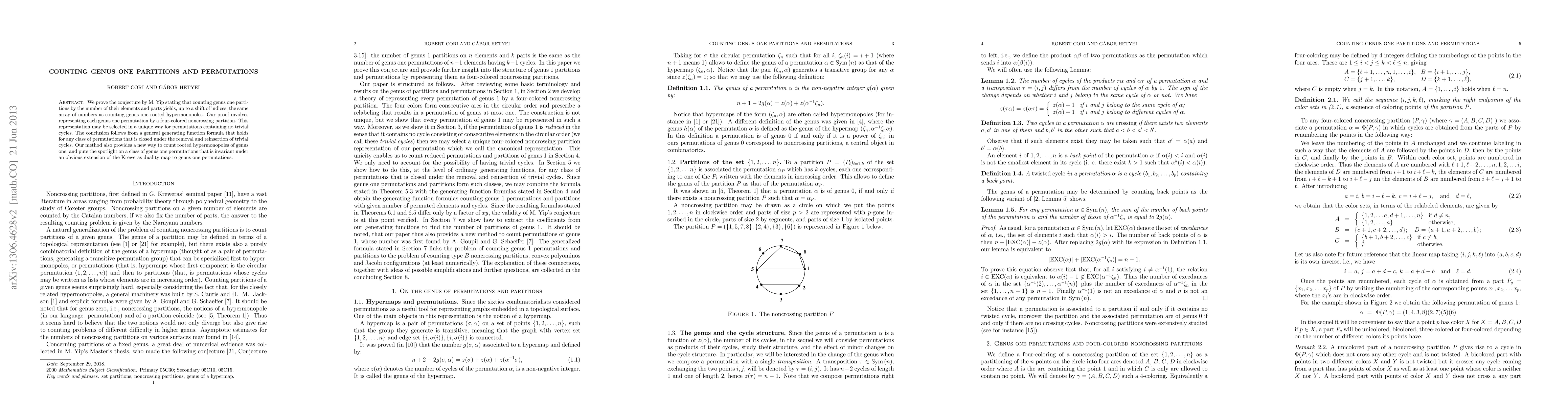 The paper proves a conjecture linking the enumeration of genus one partitions and genus one rooted hypermonopoles through a unique four-colored noncrossing partition representation of genus one permutations, establishing a generating function formula applicable to permutation classes closed under trivial cycle manipulations.