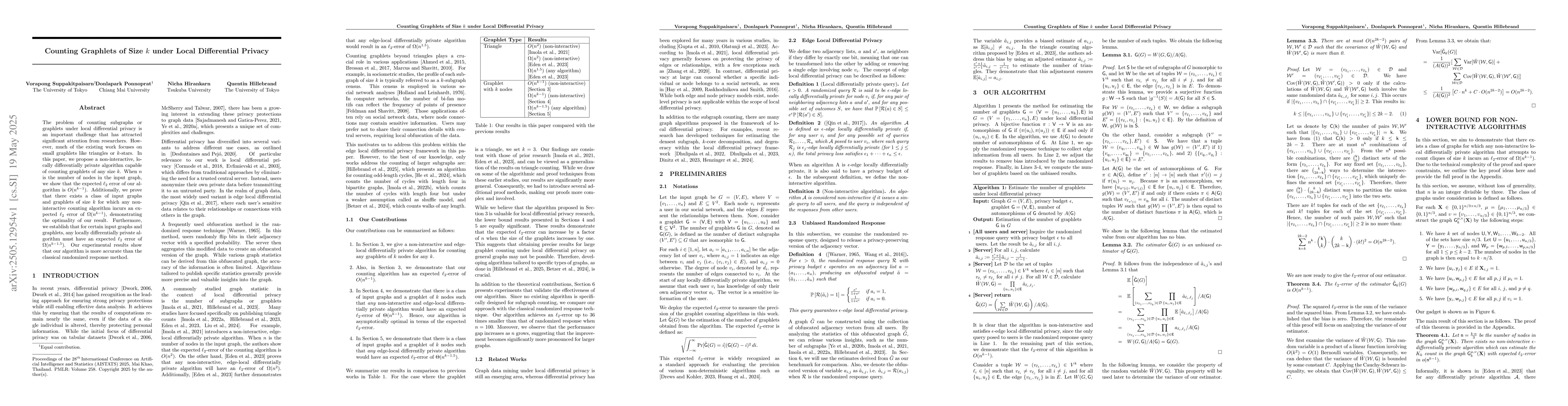 The paper proposes a non-interactive, locally differentially private algorithm for counting graphlets of any size $k$ in a graph with $n$ nodes.