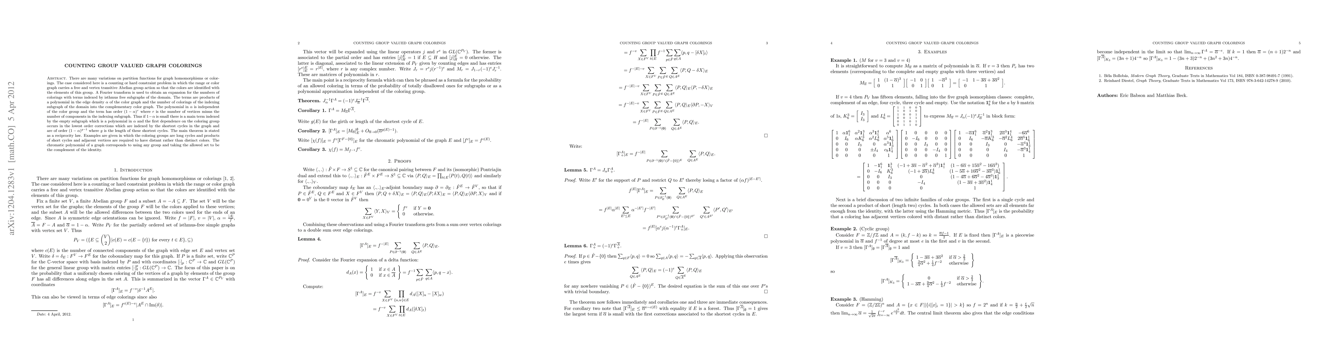 There are many variations on partition functions for graph homomorphisms or colorings. The case considered here is a counting or hard constraint problem in which the range or color graph carries a free and vertex transitive Abelian group action so that the colors are identified with the elements of this group. A Fourier transform is used to obtain an expansion for the numbers of colorings with terms indexed by isthmus free subgraphs of the domain. The terms are products of a polynomial in the edge density a of the color graph and the number of colorings of the indexing subgraph of the domain into the complementary color graph. The polynomial in a is independent of the color group and the term has order (1-a) to the r where r is the number of vertices minus the number of components in the indexing subgraph. Thus if (1-a) is small there is a main term indexed by the empty subgraph which is a polynomial in a and the first dependence on the coloring group occurs in the lowest order corrections which are indexed by the shortest cycles in the graph and are of order (1-a) to the g-1 where g is the length of these shortest cycles. The main theorem is stated as a reciprocity law. Examples are given in which the coloring groups are long cycles and products of short cycles and adjacent vertices are required to have distant rather than distinct colors. The chromatic polynomial of a graph corresponds to using any group and taking the allowed set to be the complement of the identity.