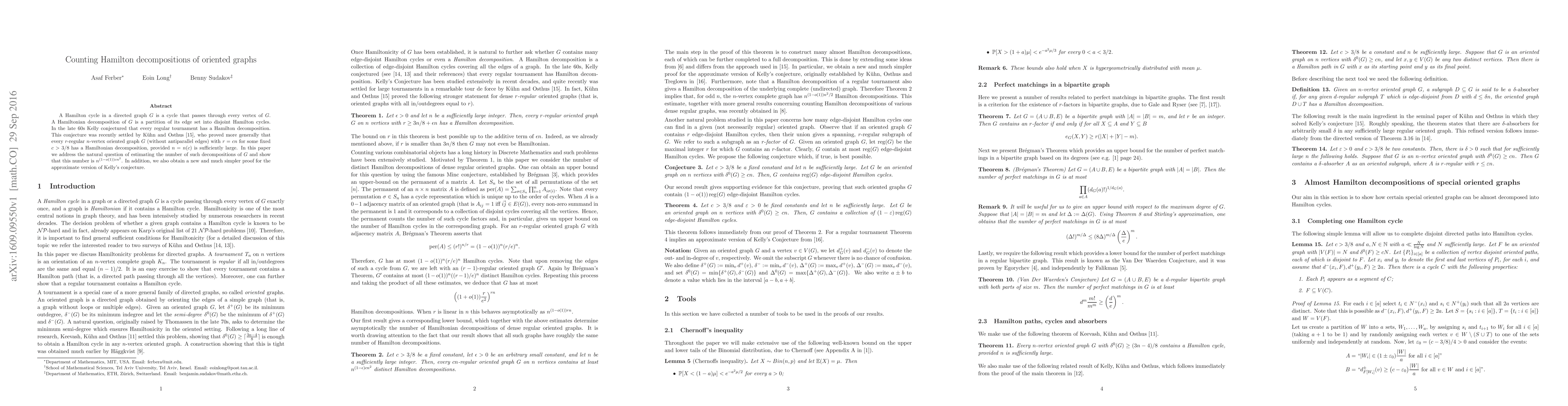 A Hamilton cycle in a directed graph $G$ is a cycle that passes through every vertex of $G$. A Hamiltonian decomposition of $G$ is a partition of its edge set into disjoint Hamilton cycles. In the late $60$s Kelly conjectured that every regular tournament has a Hamilton decomposition. This conjecture was recently settled by K\"uhn and Osthus, who proved more generally that every $r$-regular $n$-vertex oriented graph $G$ (without antiparallel edges) with $r=cn$ for some fixed $c>3/8$ has a Hamiltonian decomposition, provided $n=n(c)$ is sufficiently large. In this paper we address the natural question of estimating the number of such decompositions of $G$ and show that this number is $n^{(1-o(1))cn^2}$. In addition, we also obtain a new and much simpler proof for the approximate version of Kelly's conjecture.