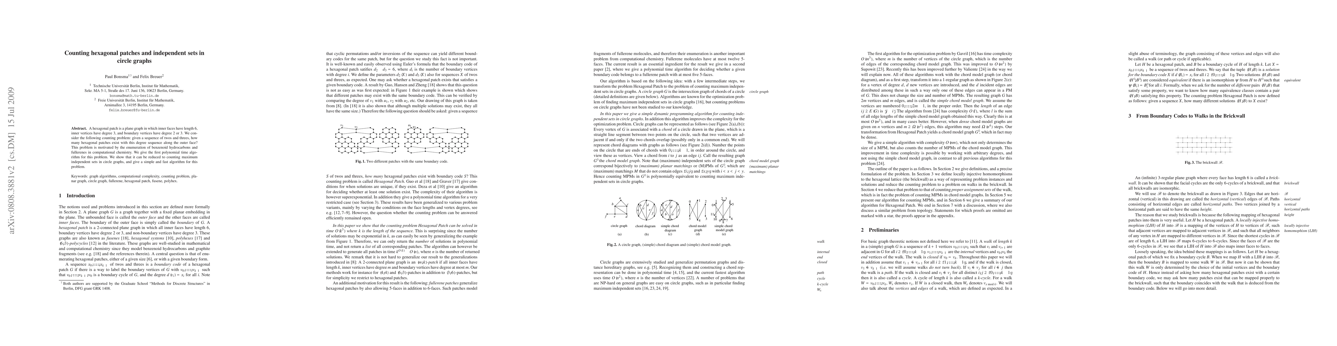 A hexagonal patch is a plane graph in which inner faces have length 6, inner vertices have degree 3, and boundary vertices have degree 2 or 3. We consider the following counting problem: given a sequence of twos and threes, how many hexagonal patches exist with this degree sequence along the outer face? This problem is motivated by the study of benzenoid hydrocarbons and fullerenes in computational chemistry. We give the first polynomial time algorithm for this problem. We show that it can be reduced to counting maximum independent sets in circle graphs, and give a simple and fast algorithm for this problem.