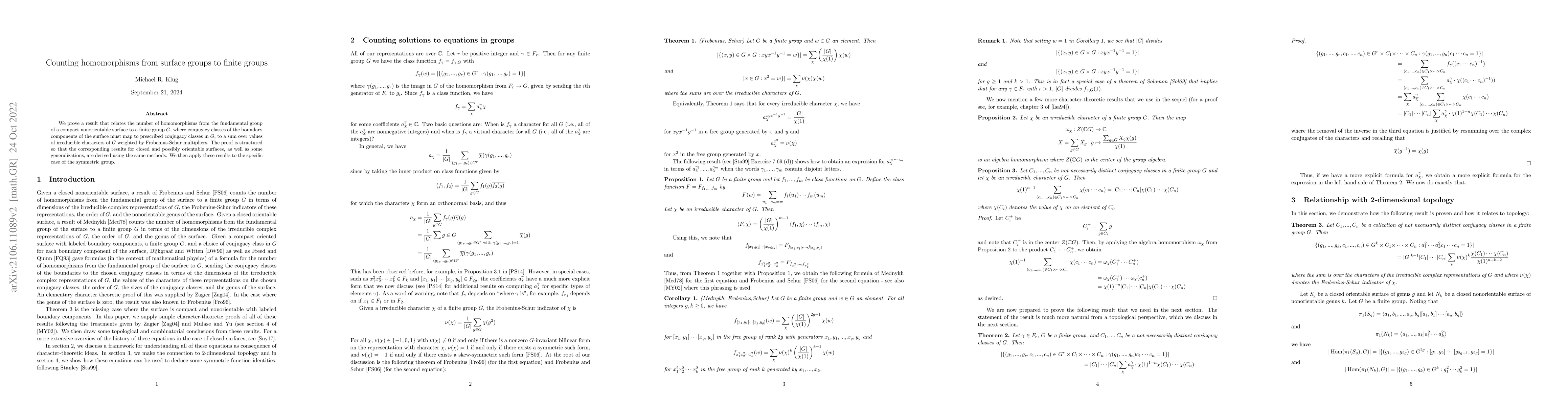 We prove a result that relates the number of homomorphisms from the fundamental group of a compact nonorientable surface to a finite group $G$, where conjugacy classes of the boundary components of the surface must map to prescribed conjugacy classes in $G$, to a sum over values of irreducible characters of $G$ weighted by Frobenius-Schur multipliers. The proof is structured so that the corresponding results for closed and possibly orientable surfaces, as well as some generalizations, are derived using the same methods. We then apply these results to the specific case of the symmetric group.