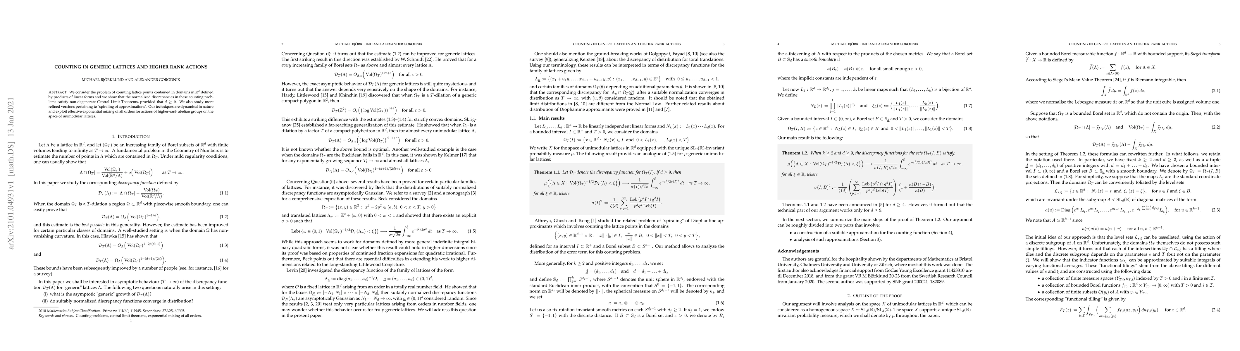 This paper investigates the counting of lattice points in high-dimensional domains defined by linear forms, demonstrating that normalized discrepancies follow non-degenerate Central Limit Theorems when the dimension is at least 9. The study also delves into refined versions involving "spiraling of approximations," utilizing dynamical methods and effective exponential mixing for higher-rank abelian group actions.