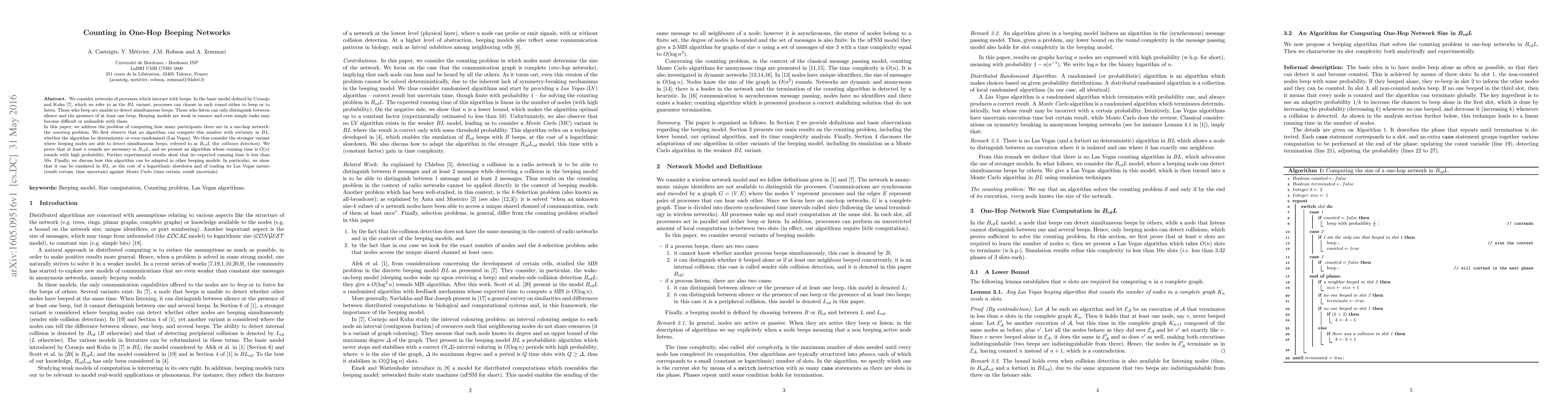 We consider networks of processes which interact with beeps. In the basic model defined by Cornejo and Kuhn, which we refer to as the $BL$ variant, processes can choose in each round either to beep or to listen. Those who beep are unable to detect simultaneous beeps. Those who listen can only distinguish between silence and the presence of at least one beep. Beeping models are weak in essence and even simple tasks may become difficult or unfeasible with them. In this paper, we address the problem of computing how many participants there are in a one-hop network: the {\em counting} problem. We first observe that no algorithm can compute this number with certainty in $BL$, whether the algorithm be deterministic or even randomised (Las Vegas). We thus consider the stronger variant where beeping nodes are able to detect simultaneous beeps, referred to as $B_{cd}L$ (for {\em collision detection}). We prove that at least $n$ rounds are necessary in $B_{cd}L$, and we present an algorithm whose running time is $O(n)$ rounds with high probability. Further experimental results show that its expected running time is less than $10n$. Finally, we discuss how this algorithm can be adapted in other beeping models. In particular, we show that it can be emulated in $BL$, at the cost of a logarithmic slowdown and of trading its Las Vegas nature (result certain, time uncertain) against Monte Carlo (time certain, result uncertain).