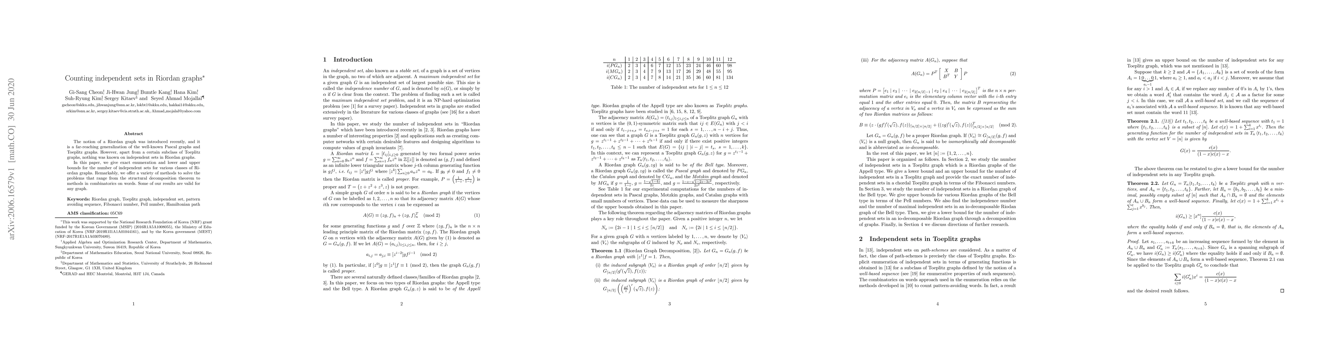 This paper provides exact enumeration and bounds for the number of independent sets in Riordan graphs, a generalization of Pascal and Toeplitz graphs. It employs various methods, including structural decomposition and combinatorial techniques, to address these problems, with some results applicable to any graph.