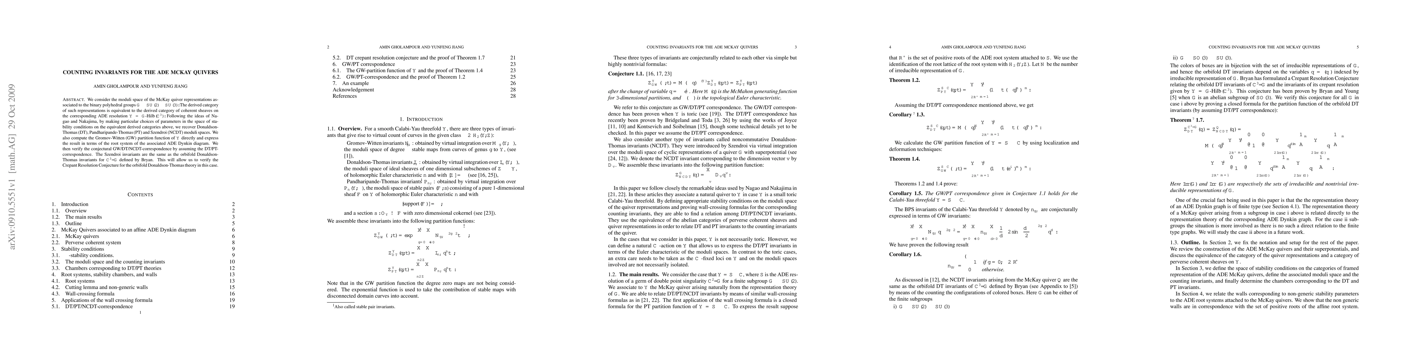 This paper recovers Donaldson-Thomas, Pandharipande-Thomas, and Szendroi moduli spaces for McKay quiver representations, computing the Gromov-Witten partition function and verifying a conjectural correspondence.