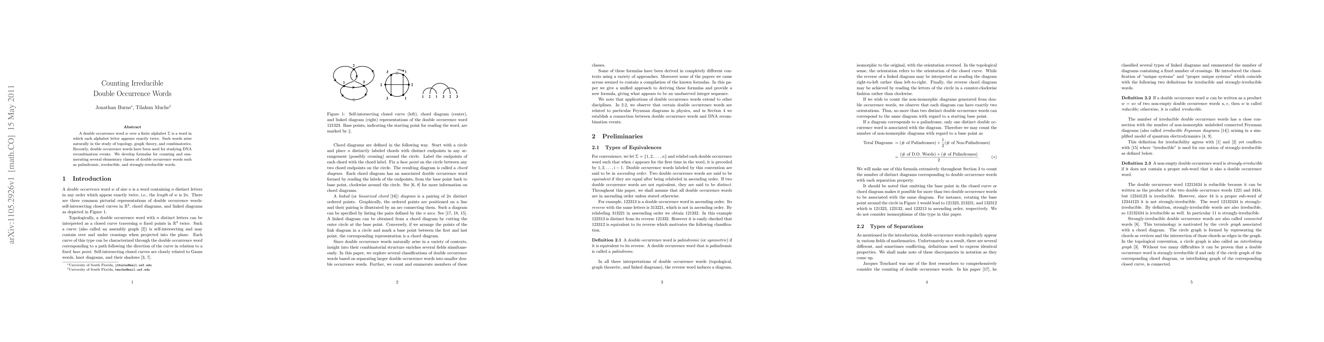 The paper develops formulas for counting various types of double occurrence words, specifically focusing on palindromic, irreducible, and strongly-irreducible classes, with applications in topology, graph theory, combinatorics, and DNA recombination studies.