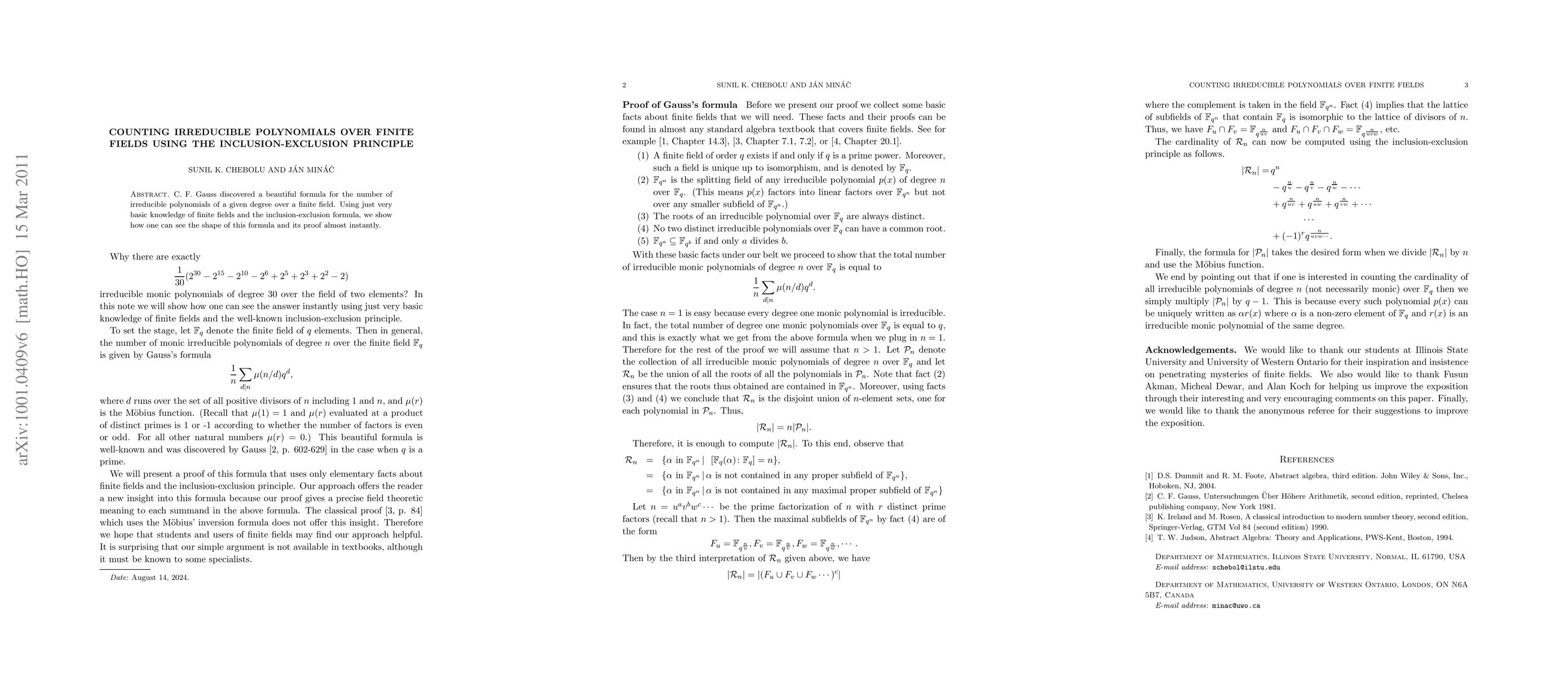 Summary: This paper presents a straightforward derivation of Gauss's formula for counting irreducible polynomials over finite fields using the inclusion-exclusion principle, elucidating the underlying structure and proof through elementary field theory.