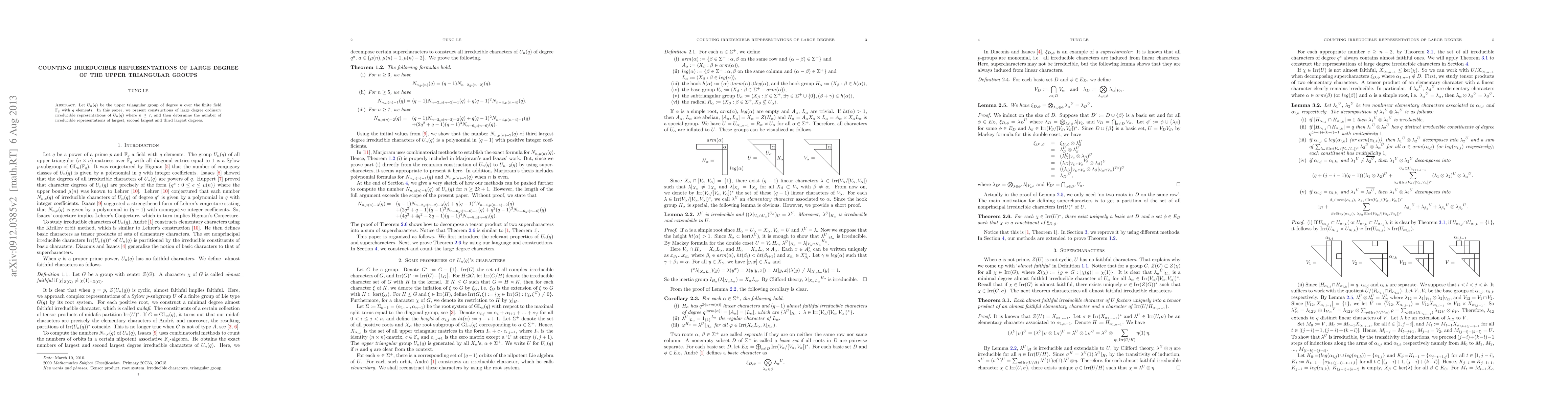 Let $U_n(q)$ be the upper triangular group of degree $n$ over the finite field $\F_q$ with $q$ elements. In this paper, we present constructions of large degree ordinary irreducible representations of $U_n(q)$ where $n\geq 7$, and then determine the number of irreducible representations of largest, second largest and third largest degrees.
