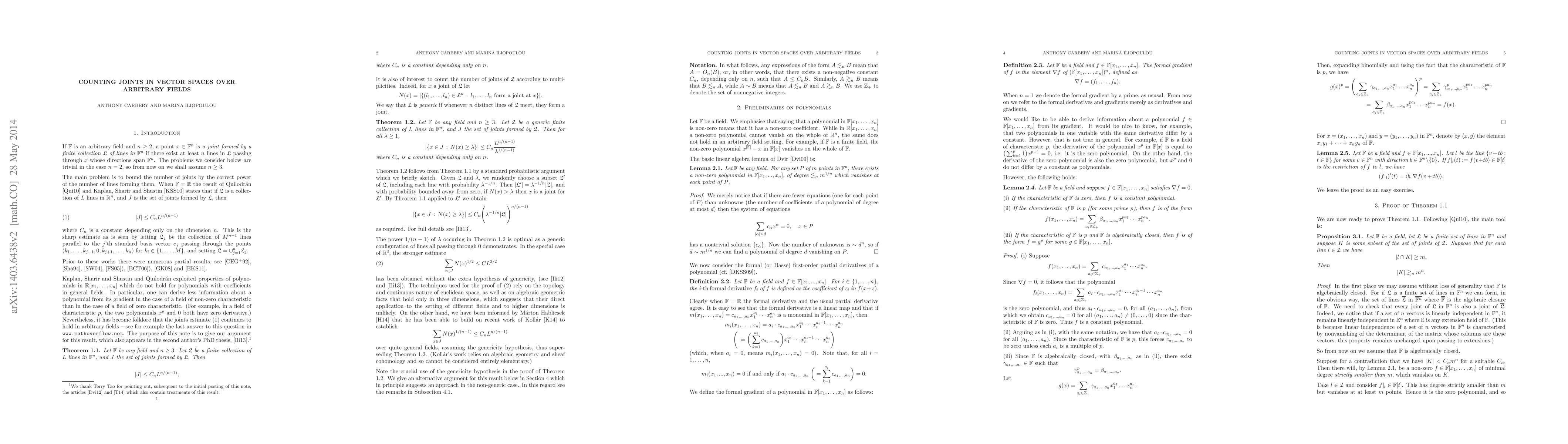 We give a proof of the "folklore" theorem that the Kaplan--Sharir--Shustin/Quilodr\'an result on counting joints associated to a family of lines holds in vector spaces over arbitrary fields, not just the reals. We also discuss a distributional estimate on the multiplicities of the joints in the case that the family of lines is sufficiently generic.