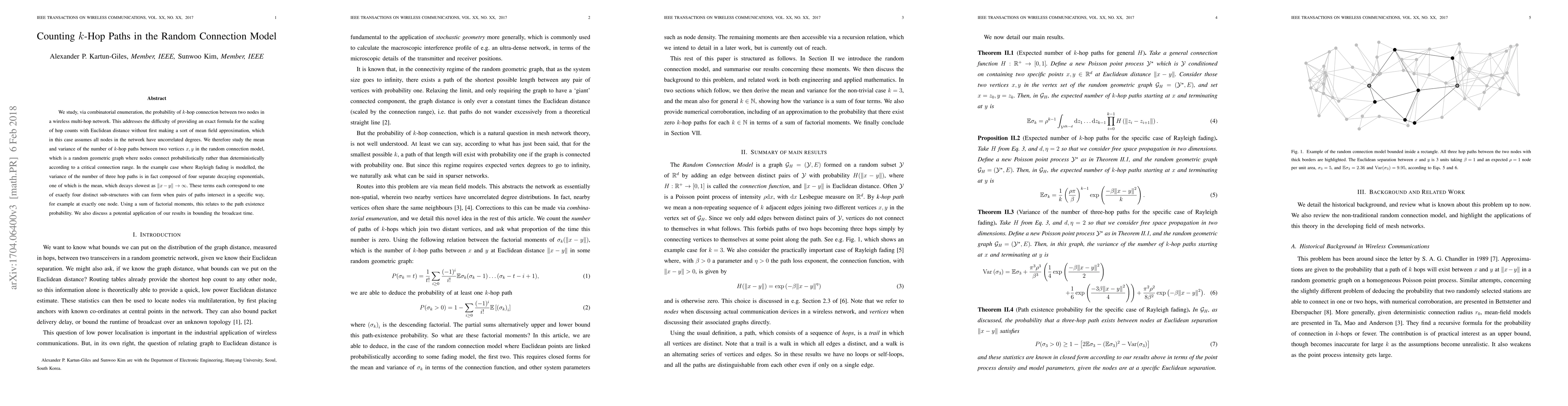 We study, via combinatorial enumeration, the probability of k-hop connection between two nodes in a wireless multi-hop network. This addresses the difficulty of providing an exact formula for the scaling of hop counts with Euclidean distance without first making a sort of mean field approximation, which in this case assumes all nodes in the network have uncorrelated degrees. We therefore study the mean and variance of the number of k-hop paths between two vertices x,y in the random connection model, which is a random geometric graph where nodes connect probabilistically rather than deterministically according to a critical connection range. In the example case where Rayleigh fading is modelled, the variance of the number of three hop paths is in fact composed of four separate decaying exponentials, one of which is the mean, which decays slowest as the Euclidean distance between the endpoints goes to infinity. These terms each correspond to one of exactly four distinct sub-structures with can form when pairs of paths intersect in a specific way, for example at exactly one node. Using a sum of factorial moments, this relates to the path existence probability. We also discuss a potential application of our results in bounding the broadcast time.