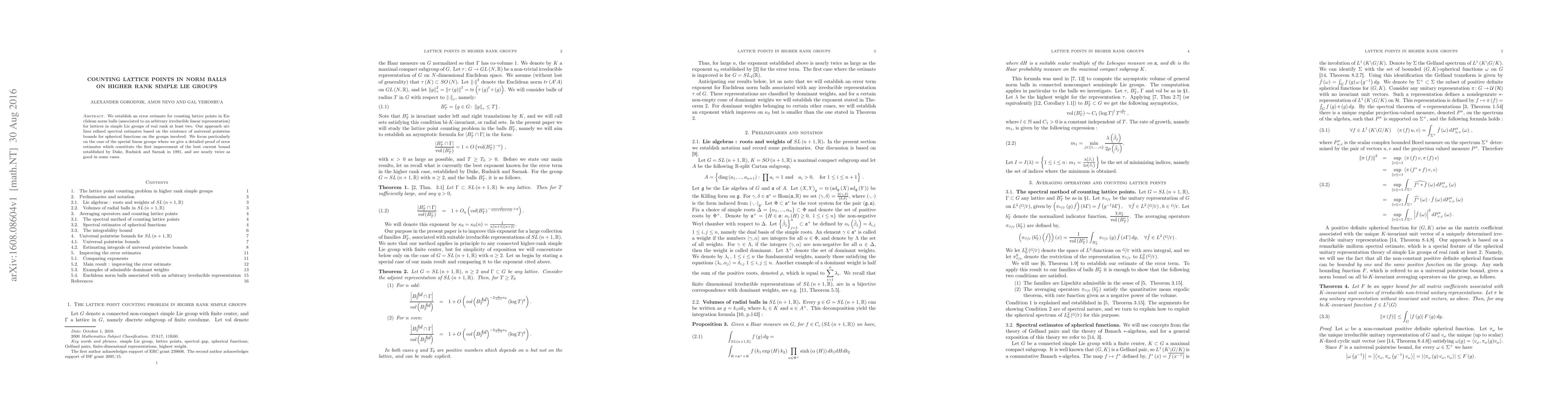We establish an error estimate for counting lattice points in Euclidean norm balls (associated to an arbitrary irreducible linear representation) for lattices in simple Lie groups of real rank at least two. Our approach utilizes refined spectral estimates based on the existence of universal pointwise bounds for spherical functions on the groups involved. We focus particularly on the case of the special linear groups where we give a detailed proof of error estimates which constitute the first improvement of the best current bound established by Duke, Rudnick and Sarnak in 1991, and are nearly twice as good in some cases.