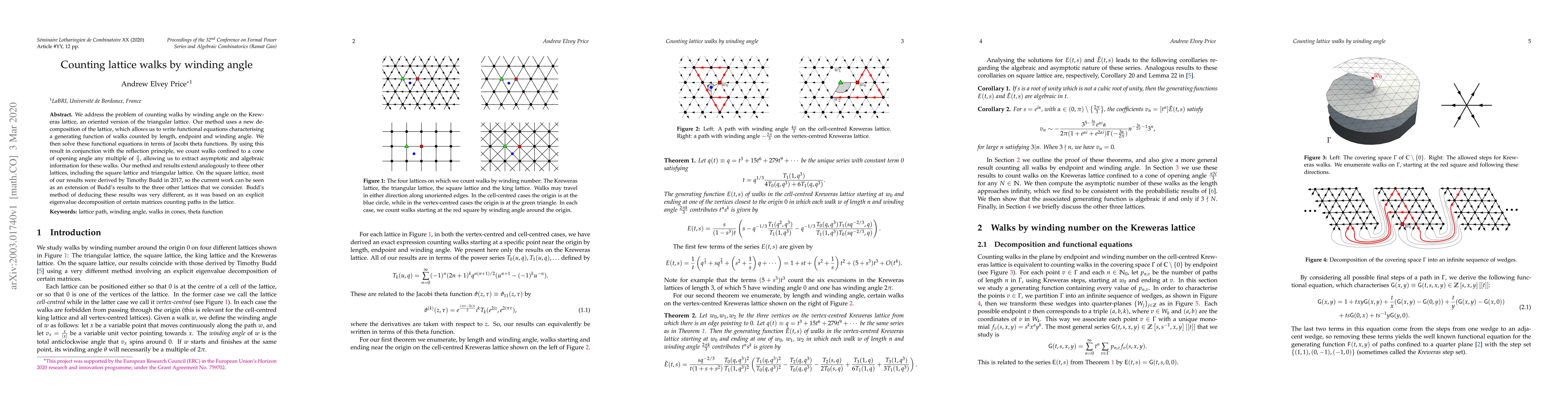We address the problem of counting walks by winding angle on the Kreweras lattice, an oriented version of the triangular lattice. Our method uses a new decomposition of the lattice, which allows us to write functional equations characterising a generating function of walks counted by length, endpoint and winding angle. We then solve these functional equations in terms of Jacobi theta functions. By using this result in conjunction with the reflection principle, we count walks confined to a cone of opening angle any multiple of $\frac{\pi}{3}$, allowing us to extract asymptotic and algebraic information for these walks. Our method and results extend analogously to three other lattices, including the square lattice and triangular lattice. On the square lattice, most of our results were derived by Timothy Budd in 2017, so the current work can be seen as an extension of Budd's results to the three other lattices that we consider. Budd's method of deducing these results was very different, as it was based on an explicit eigenvalue decomposition of certain matrices counting paths in the lattice.