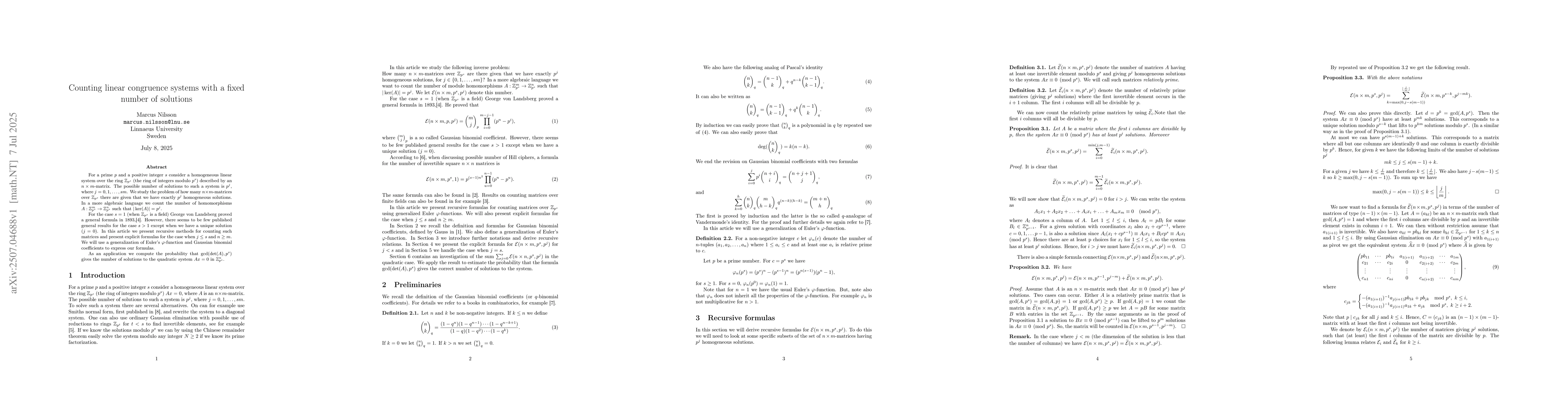 For a prime $p$ and a positive integer $s$ consider a homogeneous linear system over the ring $\mathbb{Z}_{p^s}$ (the ring of integers modulo $p^s$) described by an $n \times m$-matrix. The possible number of solutions to such a system is $p^j$, where $j=0,1,\ldots, sm$. We study the problem of how many $n \times m$-matrices over $\mathbb{Z}_{p^s}$ there are given that we have exactly $p^j$ homogeneous solutions. For the case $s=1$ (when $\mathbb{Z}_{p^s}$ is a field) George von Landsberg proved a general formula in 1893. However, there seems to be few published general results for the case $s>1$ except when we have a unique solution ($j=0$). In this article we present recursive methods for counting such matrices and present explicit formulas for the case when $j\le s$ and $n\ge m$. We will use a generalization of Euler's $\phi$-function and Gaussian binomial coefficients to express our formulas. As an application we compute the probability that gcd$(\det(A),p^s)$ gives the number of solutions to the quadratic system $Ax=0$ in $\mathbb{Z}_{p^s}$.