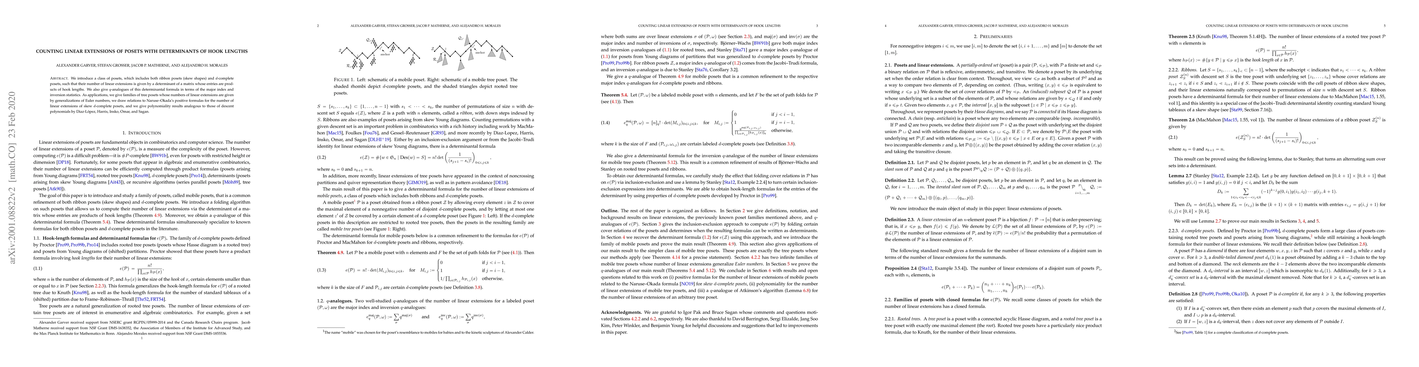 We introduce a class of posets, which includes both ribbon posets (skew shapes) and $d$-complete posets, such that their number of linear extensions is given by a determinant of a matrix whose entries are products of hook lengths. We also give $q$-analogues of this determinantal formula in terms of the major index and inversion statistics. As applications, we give families of tree posets whose numbers of linear extensions are given by generalizations of Euler numbers, we draw relations to Naruse-Okada's positive formulas for the number of linear extensions of skew $d$-complete posets, and we give polynomiality results analogous to those of descent polynomials by Diaz-L\'opez, Harris, Insko, Omar, and Sagan.