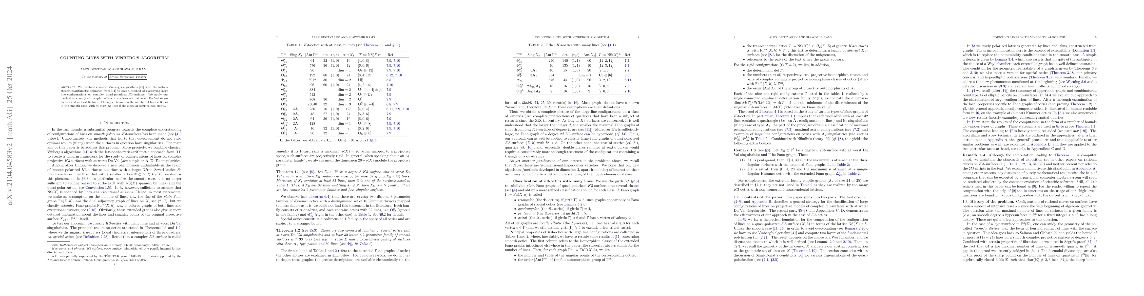 We combine classical Vinberg's algorithms with the lattice-theoretic/arithmetic approach from arXiv:1706.05734 [math.AG] to give a method of classifying large line configurations on complex quasi-polarized K3-surfaces. We apply our method to classify all complex K3-octic surfaces with at worst Du Val singularities and at least 32 lines. The upper bound on the number of lines is 36, as in the smooth case, with at most 32 lines if the singular locus is non-empty.