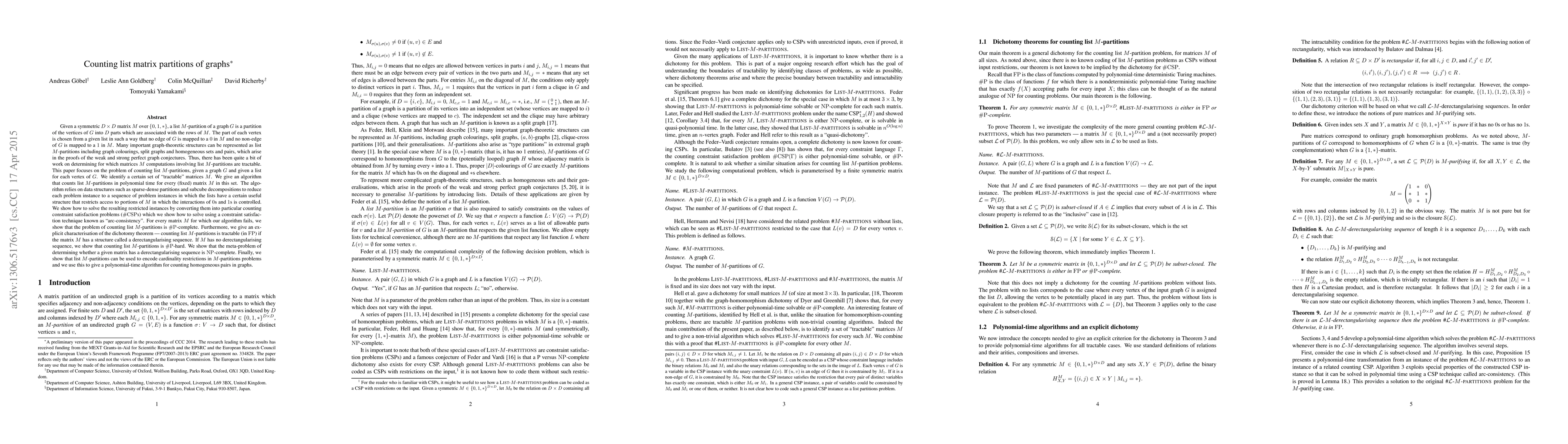 The paper presents an algorithm to count list matrix partitions in graphs for certain matrices, identifying "tractable" matrices and showing that counting for others is #P-complete. It employs data structures and arc-consistency to solve restricted instances via #CSPs, and characterizes when counting is in FP versus #P-hard.