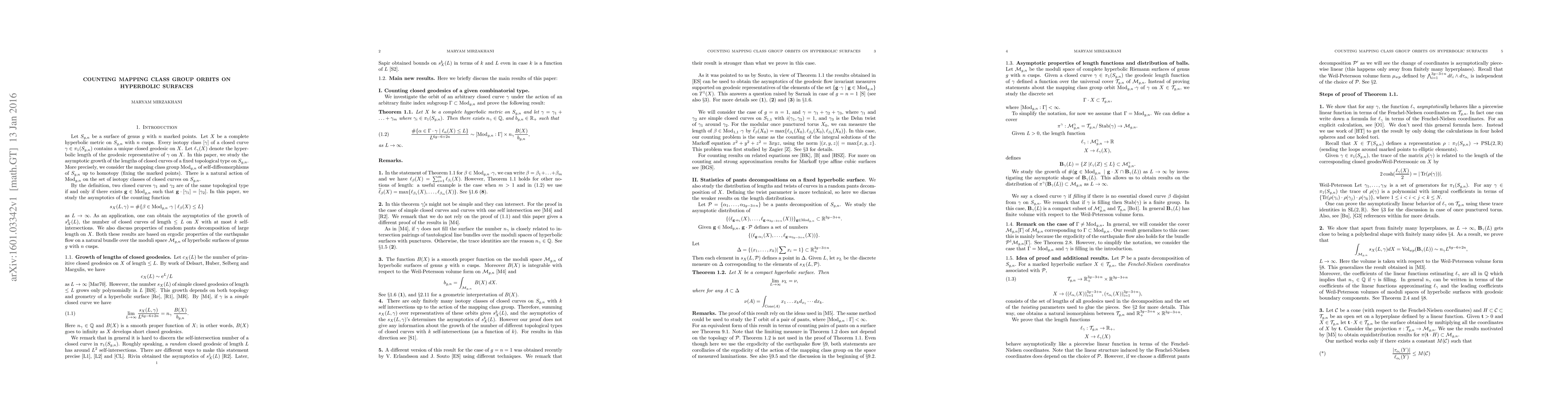 Let $S_{g,n}$ be a surface of genus $g $ with $n$ marked points. Let $X$ be a complete hyperbolic metric on $S_{g,n}$ with $n$ cusps. Every isotopy class $[\gamma]$ of a closed curve $\gamma \in \pi_{1}(S_{g,n})$ contains a unique closed geodesic on $X$. Let $\ell_{\gamma}(X)$ denote the hyperbolic length of the geodesic representative of $\gamma$ on $X$. In this paper, we study the asymptotic growth of the lengths of closed curves of a fixed topological type on $S_{g,n}.$ As an application, one can obtain the asymptotics of the growth of $s^{k}_{X}(L)$, the number of closed curves of length $\leq L$ on $X$ with at most $k$ self-intersections. We also discuss properties of random pants decomposition of large length on $X$. Both these results are based on ergodic properties of the earthquake flow on a natural bundle over the moduli space $\mathcal{M}_{g,n}$ of hyperbolic surfaces of genus $g$ with $n$ cusps.