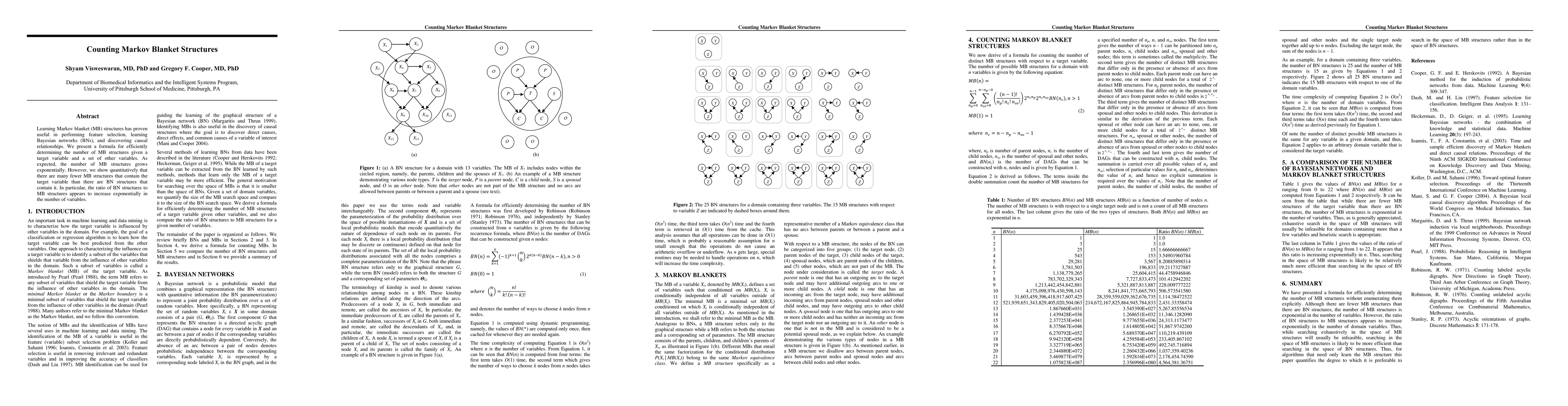 This paper presents a formula to efficiently count Markov blanket structures, which are crucial for feature selection and Bayesian network learning. It shows that while the total number of such structures grows exponentially, the number containing a target variable is significantly fewer compared to Bayesian network structures, with the ratio increasing exponentially with the number of variables.