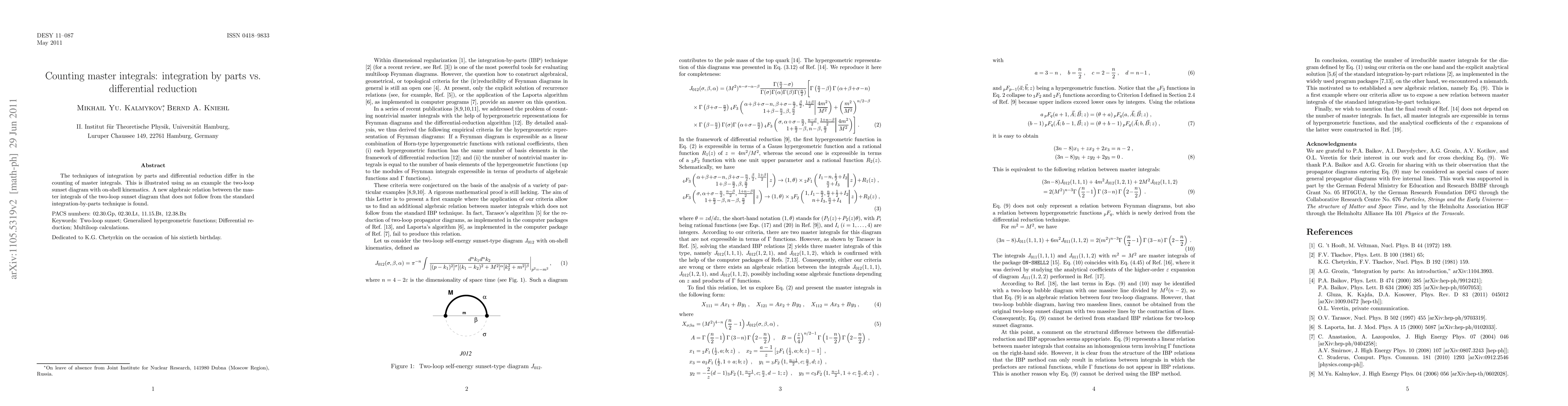 Summary: The paper compares integration by parts and differential reduction techniques in counting master integrals, using the two-loop sunset diagram as a case study. It discovers a new algebraic relation between master integrals that is unique to differential reduction.