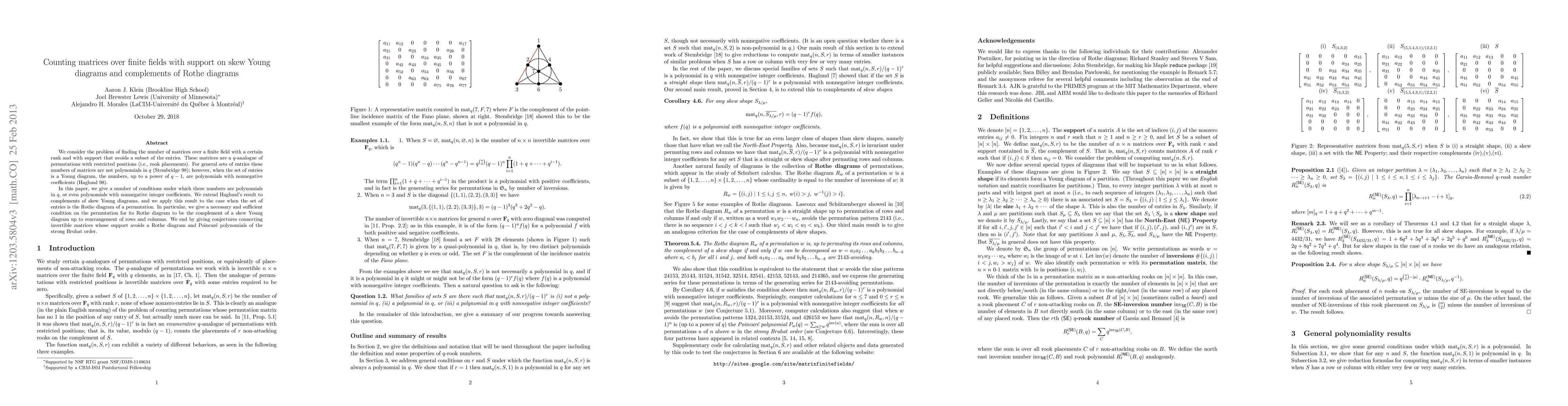 This paper investigates the enumeration of matrices over finite fields with specific rank and support constraints, focusing on skew Young diagrams and their complements. It extends previous results to show that under certain conditions, these matrix counts yield polynomials in q, and provides a necessary and sufficient condition for the Rothe diagram of a permutation to be the complement of a skew Young diagram.