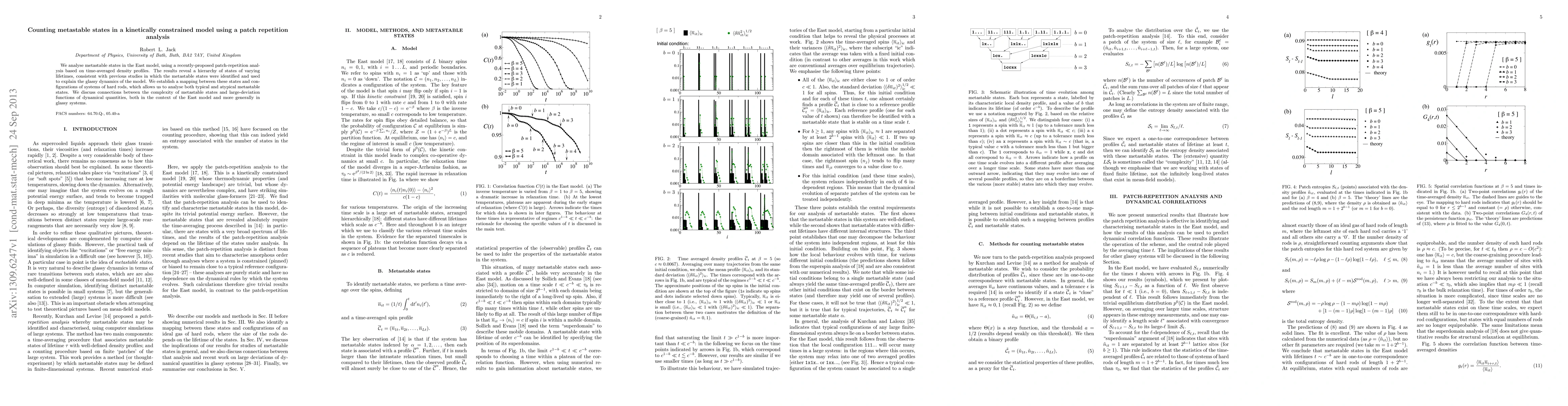 This paper uses patch-repetition analysis to identify and categorize metastable states in the East model, revealing a hierarchy of states with varying lifetimes. The study establishes a connection between these states and configurations of hard rods, providing insights into both typical and atypical metastable states and their relation to large-deviation functions in glassy systems.