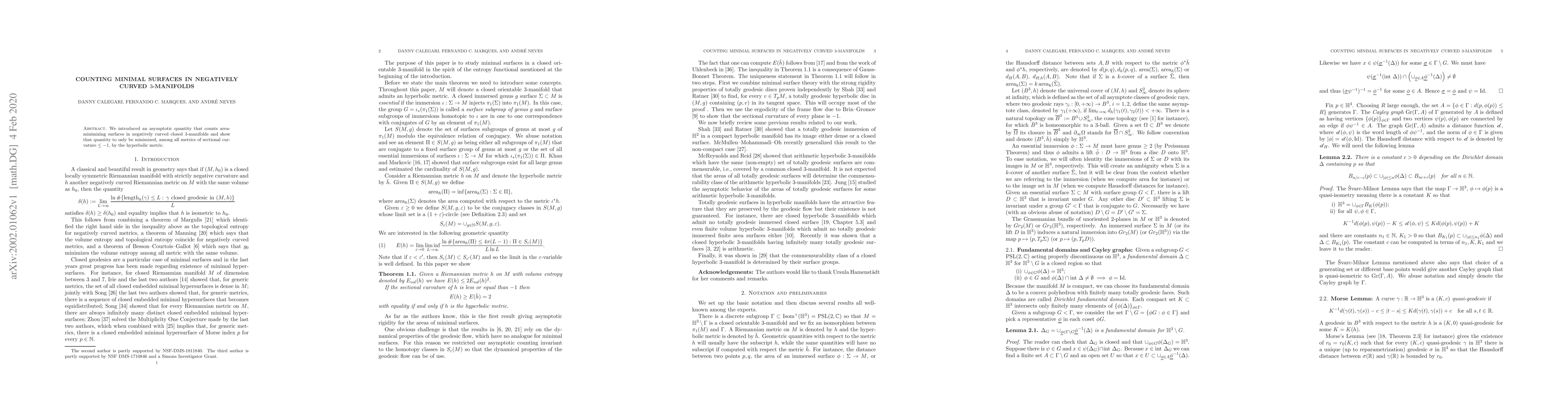 Summary: This paper introduces an asymptotic measure for counting minimal surfaces in negatively curved 3-manifolds and demonstrates that this measure is minimized uniquely by the hyperbolic metric among all metrics with sectional curvature ≤ -1.