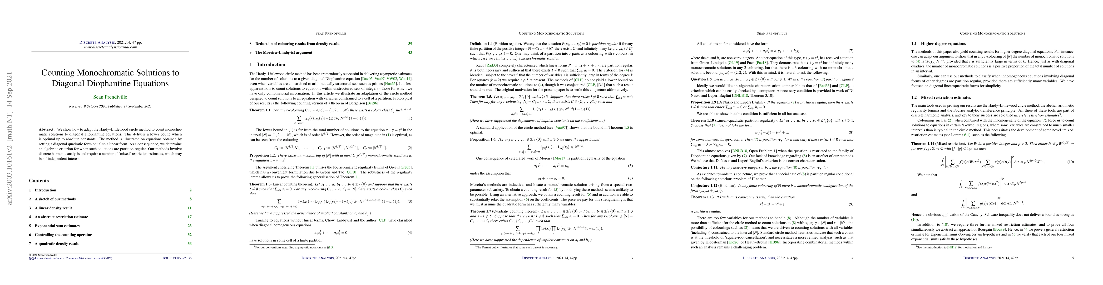 We show how to adapt the Hardy--Littlewood circle method to count monochromatic solutions to diagonal Diophantine equations. This delivers a lower bound which is optimal up to absolute constants. The method is illustrated on equations obtained by setting a diagonal quadratic form equal to a linear form. As a consequence, we determine an algebraic criterion for when such equations are partition regular. Our methods involve discrete harmonic analysis and require a number of `mixed' restriction estimates, which may be of independent interest.