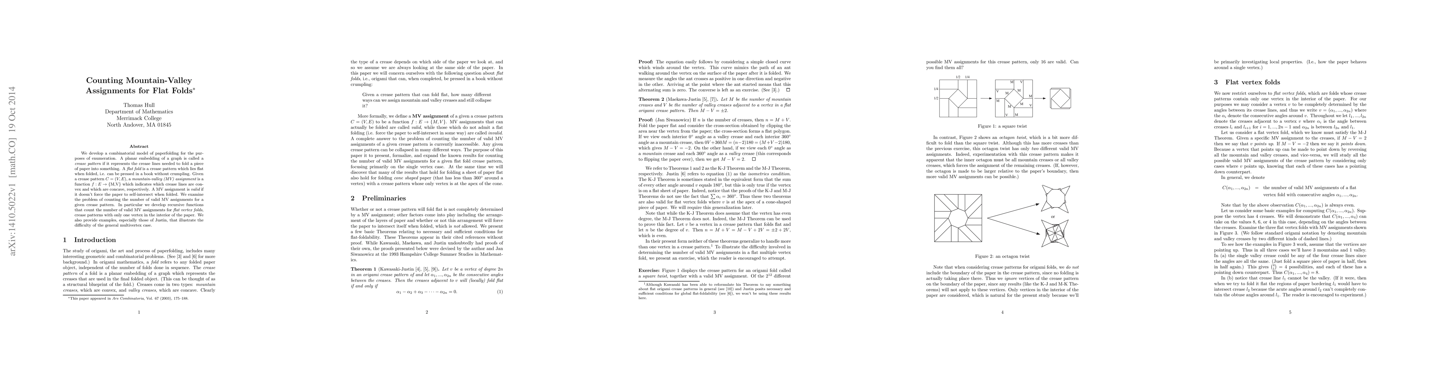 The paper develops a combinatorial model for paperfolding, focusing on enumeration. It introduces the concept of flat vertex folds, crease patterns with a single interior vertex, and examines the problem of counting valid mountain-valley (MV) assignments for these patterns using recursive functions.