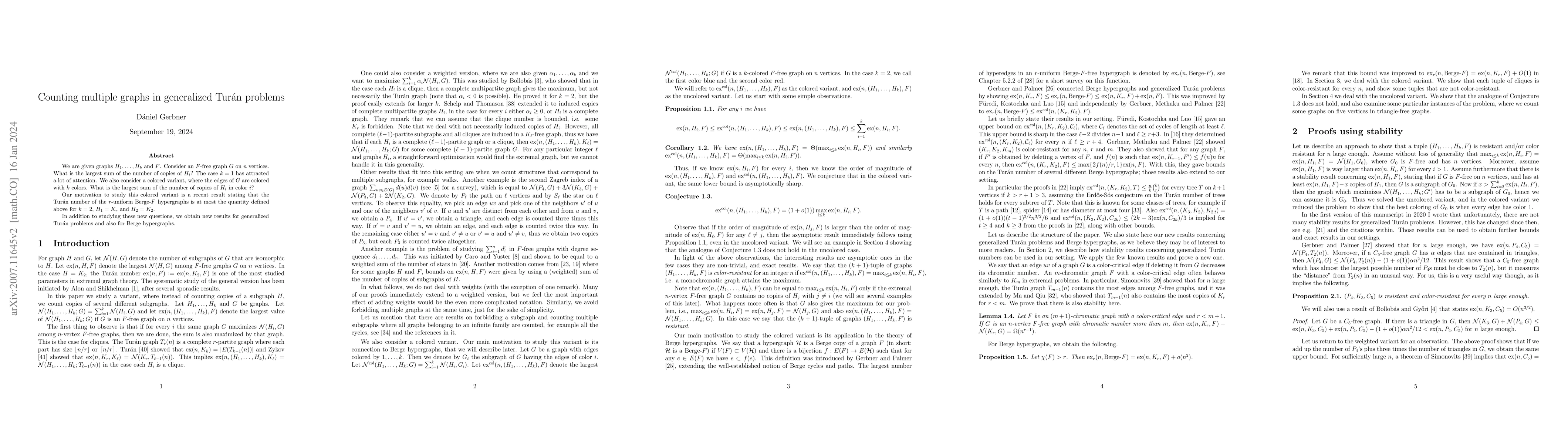 We are given graphs $H_1,\dots,H_k$ and $F$. Consider an $F$-free graph $G$ on $n$ vertices. What is the largest sum of the number of copies of $H_i$? The case $k=1$ has attracted a lot of attention. We also consider a colored variant, where the edges of $G$ are colored with $k$ colors. What is the largest sum of the number of copies of $H_i$ in color $i$? Our motivation to study this colored variant is a recent result stating that the Tur\'an number of the $r$-uniform Berge-$F$ hypergraphs is at most the quantity defined above for $k=2$, $H_1=K_r$ and $H_2=K_2$. In addition to studying these new questions, we obtain new results for generalized Tur\'an problems and also for Berge hypergraphs.