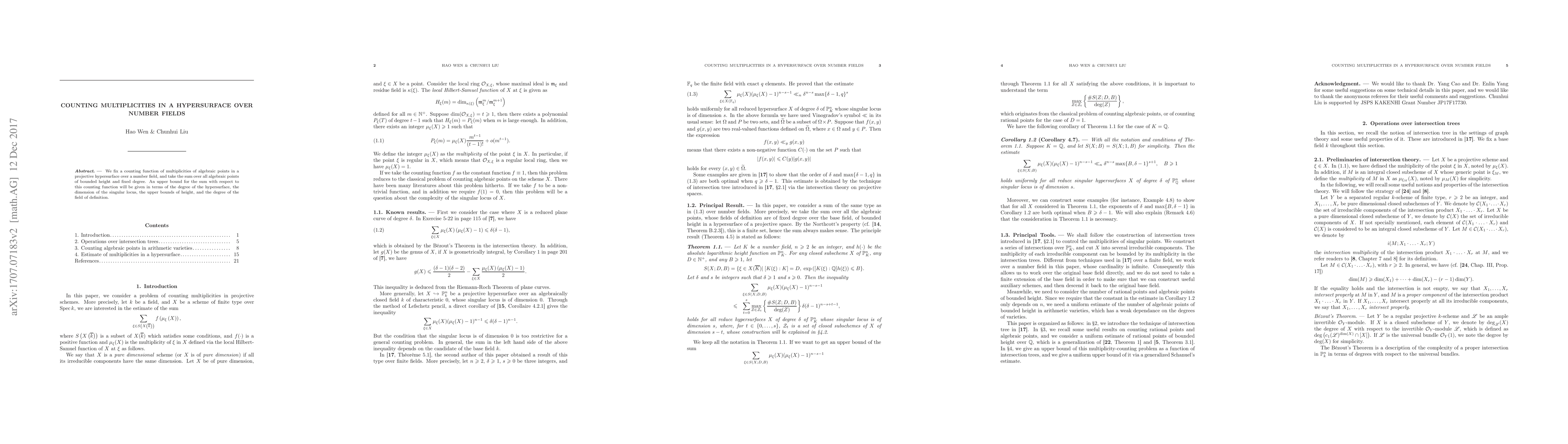 This paper establishes an upper bound for counting multiplicities of algebraic points in a hypersurface over a number field, considering factors such as degree, singular locus dimension, height bounds, and field degree.
