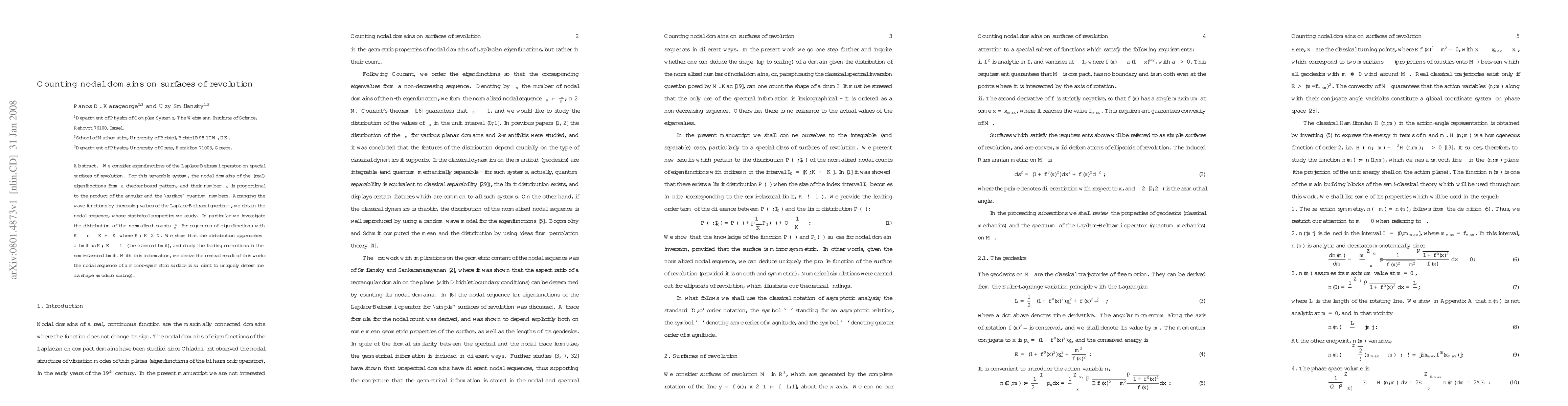 We consider eigenfunctions of the Laplace-Beltrami operator on special surfaces of revolution. For this separable system, the nodal domains of the (real) eigenfunctions form a checker-board pattern, and their number $\nu_n$ is proportional to the product of the angular and the "surface" quantum numbers. Arranging the wave functions by increasing values of the Laplace-Beltrami spectrum, we obtain the nodal sequence, whose statistical properties we study. In particular we investigate the distribution of the normalized counts $\frac{\nu_n}{n}$ for sequences of eigenfunctions with $K \le n\le K + \Delta K$ where $K,\Delta K \in \mathbb{N}$. We show that the distribution approaches a limit as $K,\Delta K\to\infty$ (the classical limit), and study the leading corrections in the semi-classical limit. With this information, we derive the central result of this work: the nodal sequence of a mirror-symmetric surface is sufficient to uniquely determine its shape (modulo scaling).