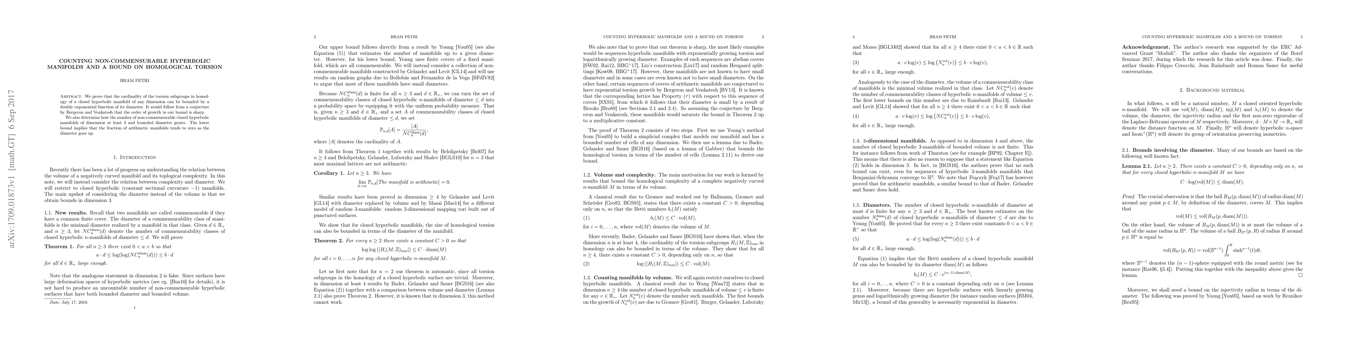 This paper establishes a doubly exponential bound on the homological torsion of closed hyperbolic manifolds based on their diameter, and explores the growth rate of non-commensurable hyperbolic manifolds, showing that the fraction of arithmetic manifolds diminishes as the diameter increases.