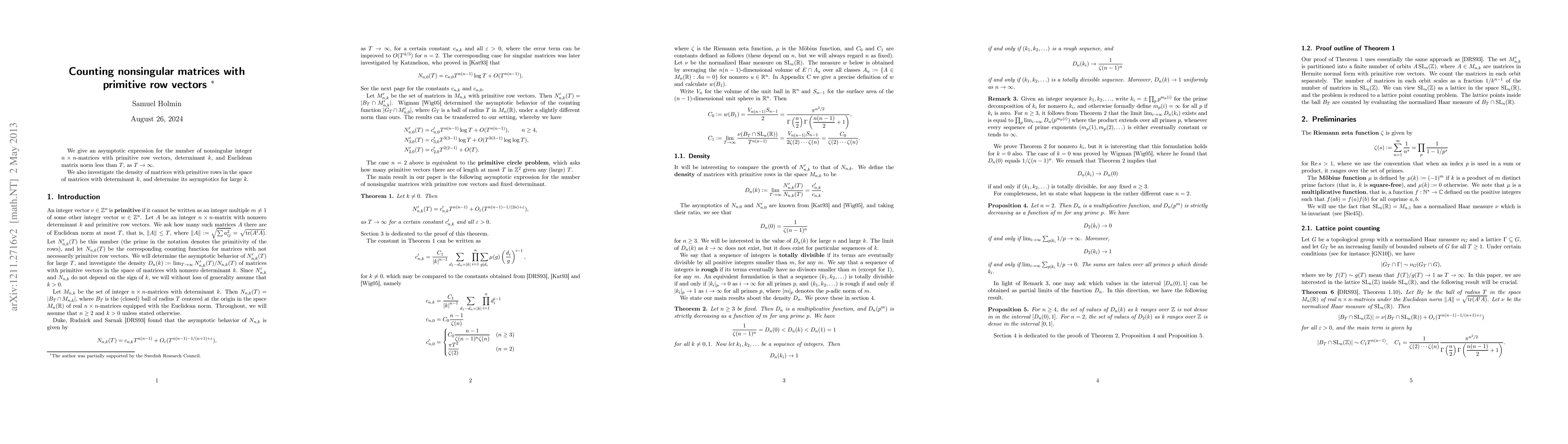 This paper provides an asymptotic formula for the number of large nonsingular integer matrices with primitive row vectors, determinant k, and a norm below T. It also examines the density of such matrices within the space of matrices with a fixed determinant k, determining its asymptotic behavior for large k.