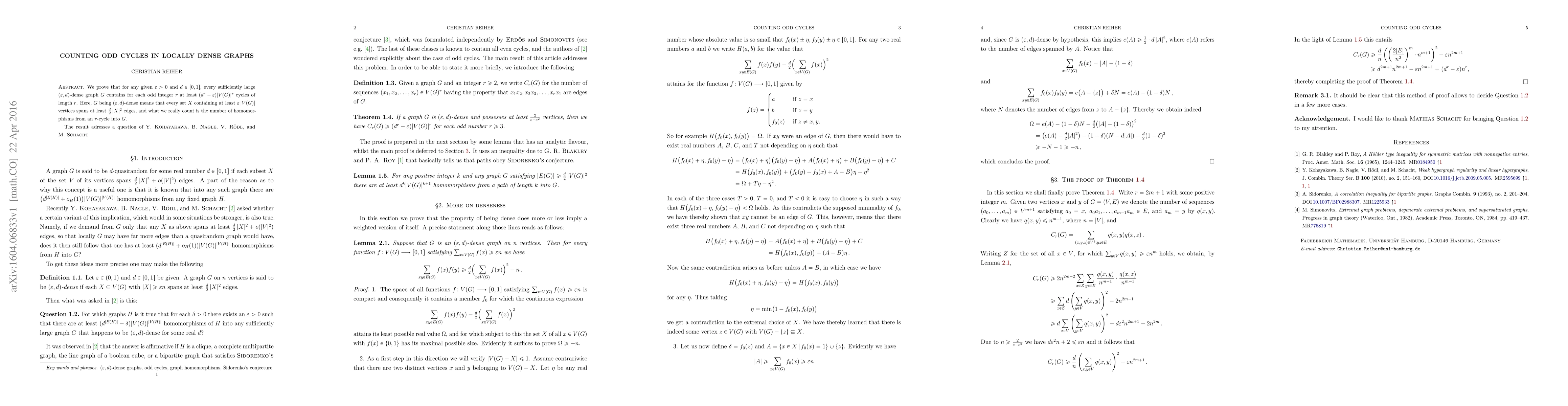 We prove that for any given $\varepsilon>0$ and $d\in [0,1]$, every sufficiently large $(\varepsilon, d)$-dense graph $G$ contains for each odd integer $r$ at least $(d^r-\varepsilon)|V(G)|^r$ cycles of length $r$. Here, $G$ being $(\varepsilon, d)$-dense means that every set $X$ containing at least~$\varepsilon\,|V(G)|$ vertices spans at least $\tfrac d2\, |X|^2$ edges, and what we really count is the number of homomorphisms from an $r$-cycle into $G$. The result adresses a question of Y. Kohayakawa, B. Nagle, V. R\"odl, and M. Schacht.