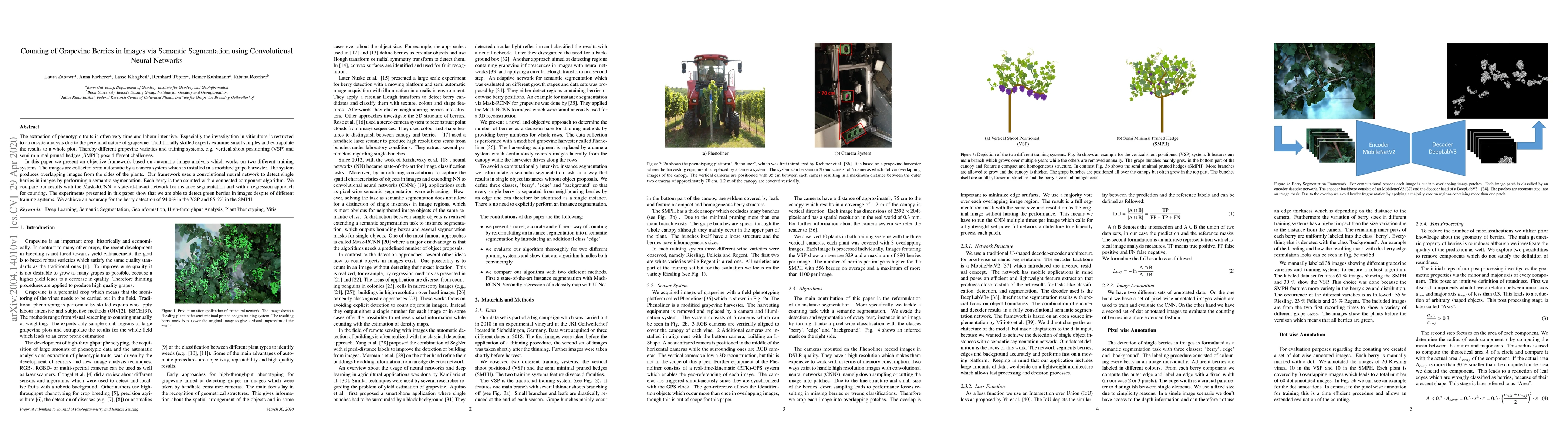 This paper presents an automated framework using convolutional neural networks for semantic segmentation to count grapevine berries in images, addressing the labor-intensive nature of traditional viticulture analysis. The proposed method achieves an accuracy of 94.0% for vertical shoot positioning and 85.6% for semi minimal pruned hedges, outperforming a regression approach and competing with Mask-RCNN.