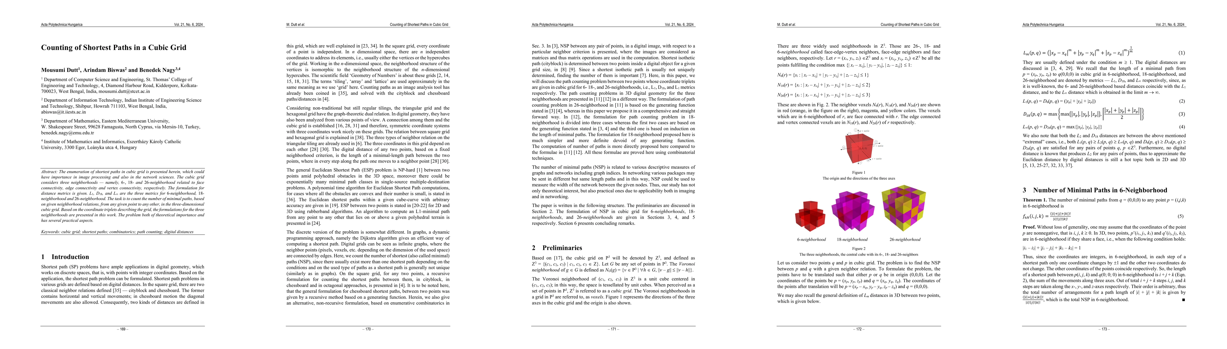 Researchers studied counting shortest paths in cubic grids with different neighborhoods, finding a way to calculate distances and paths between points for face, edge, and vertex connections.