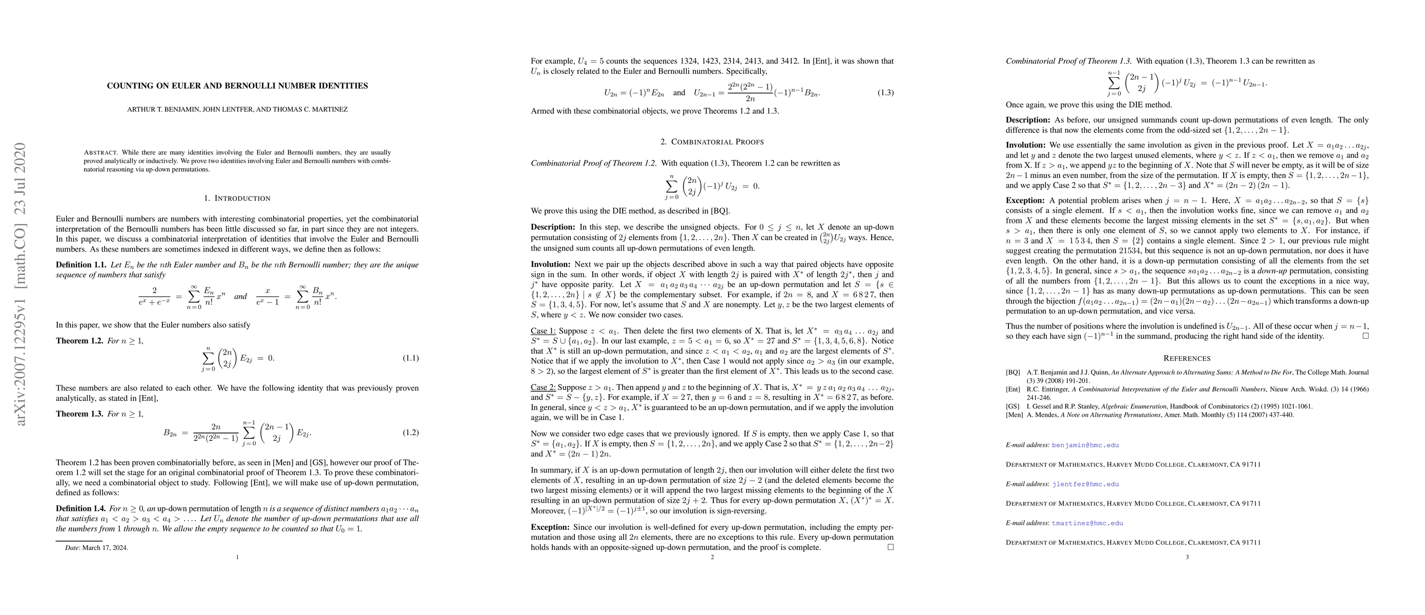 This paper proves two identities related to Euler and Bernoulli numbers using combinatorial reasoning through the concept of up-down permutations, offering a novel approach beyond traditional analytical or inductive methods.