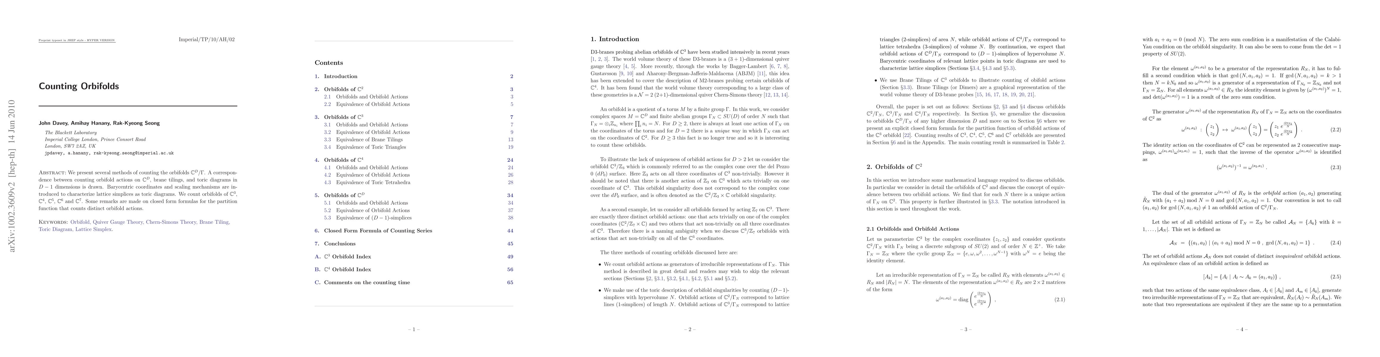 This paper introduces methods for counting orbifolds of the form C^D/Gamma, establishing a correspondence between these counts and brane tilings and toric diagrams. It presents results for dimensions D=3 to D=7 and discusses potential closed form formulas for partition functions.