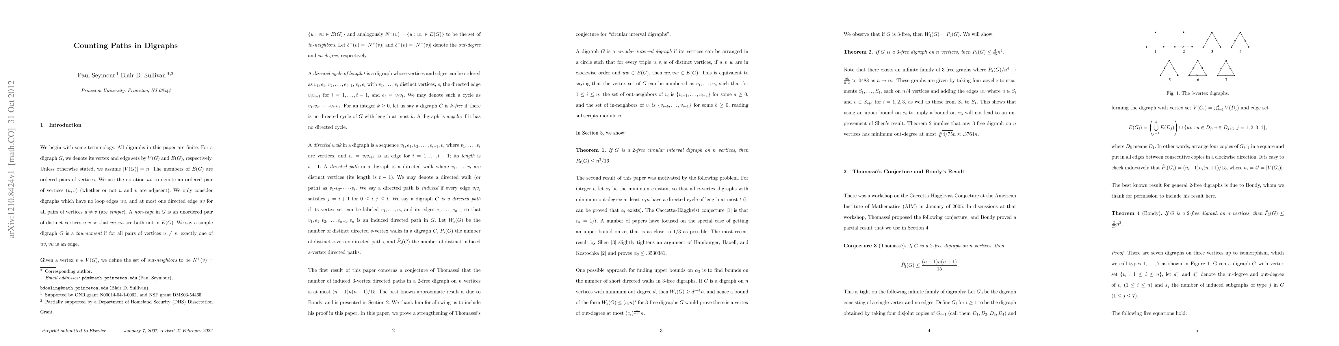Say a digraph is k-free if it has no directed cycles of length at most k, for positive integers k. Thomasse conjectured that the number of induced 3-vertex directed paths in a simple 2-free digraph on n vertices is at most (n-1)n(n+1)/15. We present an unpublished result of Bondy proving that there are at most 2n^3/25 such paths, and prove that for the class of circular interval digraphs, an upper bound of n^3/16 holds. We also study the problem of bounding the number of (non-induced) 4-vertex paths in 3-free digraphs. We show an upper bound of 4n^4/75 using Bondy's result for Thomasse's conjecture.