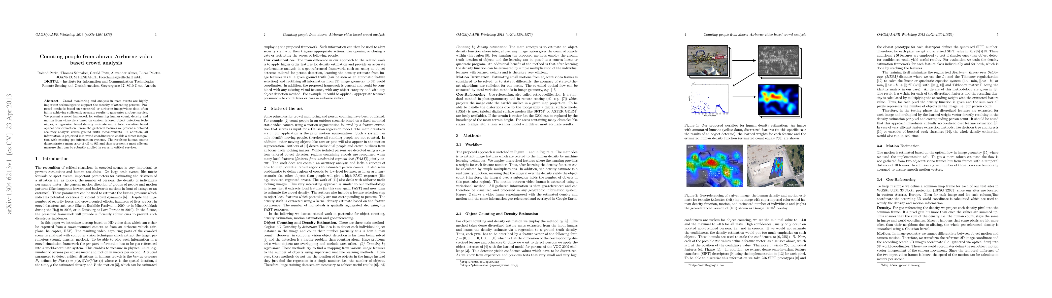 Crowd monitoring and analysis in mass events are highly important technologies to support the security of attending persons. Proposed methods based on terrestrial or airborne image/video data often fail in achieving sufficiently accurate results to guarantee a robust service. We present a novel framework for estimating human count, density and motion from video data based on custom tailored object detection techniques, a regression based density estimate and a total variation based optical flow extraction. From the gathered features we present a detailed accuracy analysis versus ground truth measurements. In addition, all information is projected into world coordinates to enable a direct integration with existing geo-information systems. The resulting human counts demonstrate a mean error of 4% to 9% and thus represent a most efficient measure that can be robustly applied in security critical services.