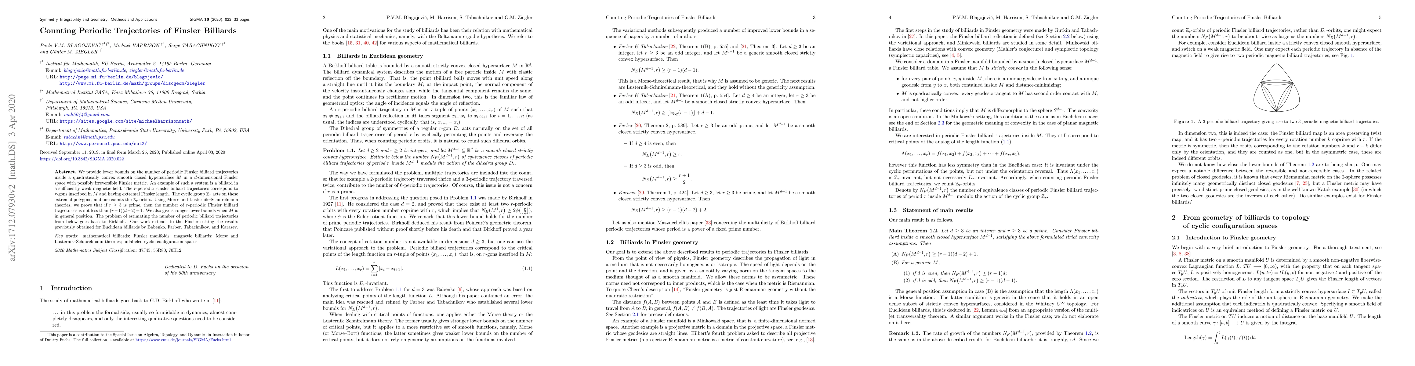 We provide lower bounds on the number of periodic Finsler billiard trajectories inside a quadratically convex smooth closed hypersurface $M$ in a $d$-dimensional Finsler space with possibly irreversible Finsler metric. An example of such a system is a billiard in a sufficiently weak magnetic field. The $r$-periodic Finsler billiard trajectories correspond to $r$-gons inscribed in $M$ and having extremal Finsler length. The cyclic group ${\mathbb Z}_r$ acts on these extremal polygons, and one counts the ${\mathbb Z}_r$-orbits. Using Morse and Lusternik-Schnirelmann theories, we prove that if $r\ge 3$ is prime, then the number of $r$-periodic Finsler billiard trajectories is not less than $(r-1)(d-2)+1$. We also give stronger lower bounds when $M$ is in general position. The problem of estimating the number of periodic billiard trajectories from below goes back to Birkhoff. Our work extends to the Finsler setting the results previously obtained for Euclidean billiards by Babenko, Farber, Tabachnikov, and Karasev.