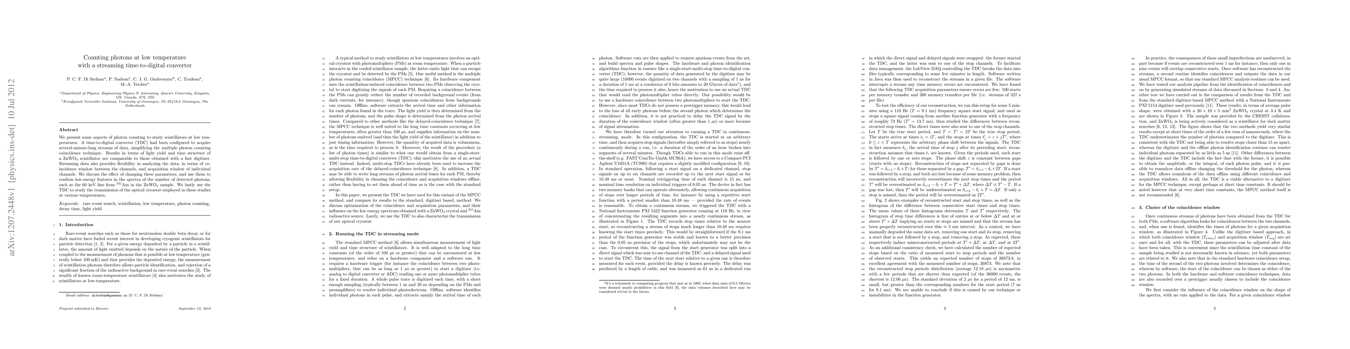 We present some aspects of photon counting to study scintillators at low temperatures. A time-to-digital converter (TDC) had been configured to acquire several-minute-long streams of data, simplifying the multiple photon counting coincidence technique. Results in terms of light yield and time structure of a ZnWO4 scintillator are comparable to those obtained with a fast digitizer. Streaming data also provides flexibility in analyzing the data, in terms of coincidence window between the channels, and acquisition window of individual channels. We discuss the effect of changing these parameters, and use them to confirm low-energy features in the spectra of the number of detected photons, such as the 60 keV line from 241Am in the ZnWO4 sample. We lastly use the TDC to study the transmission of the optical cryostat employed in these studies at various temperatures.