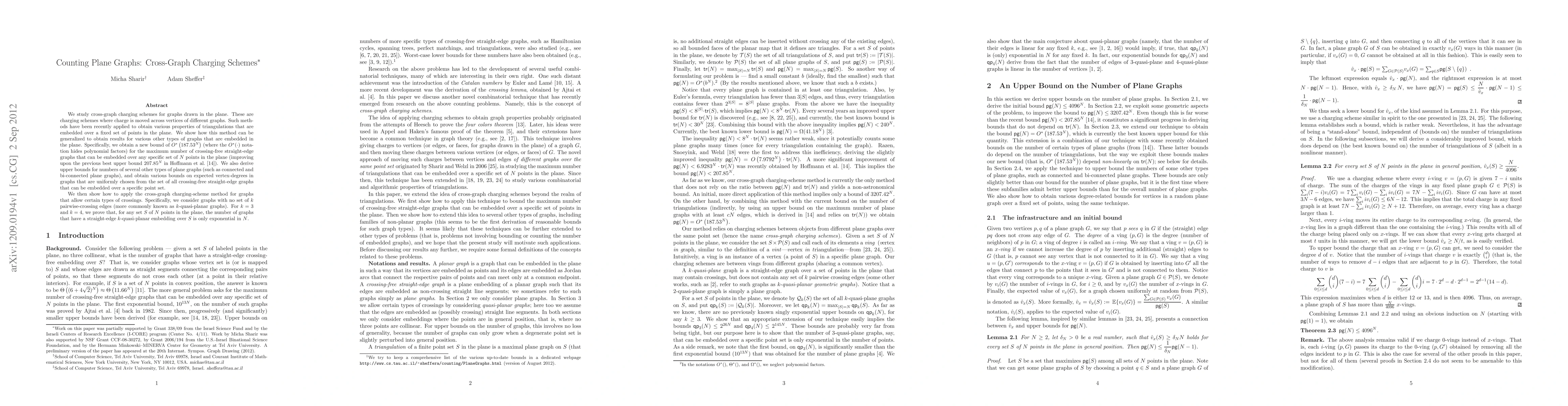 We study cross-graph charging schemes for graphs drawn in the plane. These are charging schemes where charge is moved across vertices of different graphs. Such methods have been recently applied to obtain various properties of triangulations that are embedded over a fixed set of points in the plane. We show how this method can be generalized to obtain results for various other types of graphs that are embedded in the plane. Specifically, we obtain a new bound of $O^*(187.53^N)$ (where the $O^*()$ notation hides polynomial factors) for the maximum number of crossing-free straight-edge graphs that can be embedded over any specific set of $N$ points in the plane (improving upon the previous best upper bound $207.85^N$ in Hoffmann et al.). We also derive upper bounds for numbers of several other types of plane graphs (such as connected and bi-connected plane graphs), and obtain various bounds on expected vertex-degrees in graphs that are uniformly chosen from the set of all crossing-free straight-edge graphs that can be embedded over a specific point set. We then show how to apply the cross-graph charging-scheme method for graphs that allow certain types of crossings. Specifically, we consider graphs with no set of $k$ pairwise-crossing edges (more commonly known as $k$-quasi-planar graphs). For $k=3$ and $k=4$, we prove that, for any set $S$ of $N$ points in the plane, the number of graphs that have a straight-edge $k$-quasi-planar embedding over $S$ is only exponential in $N$.