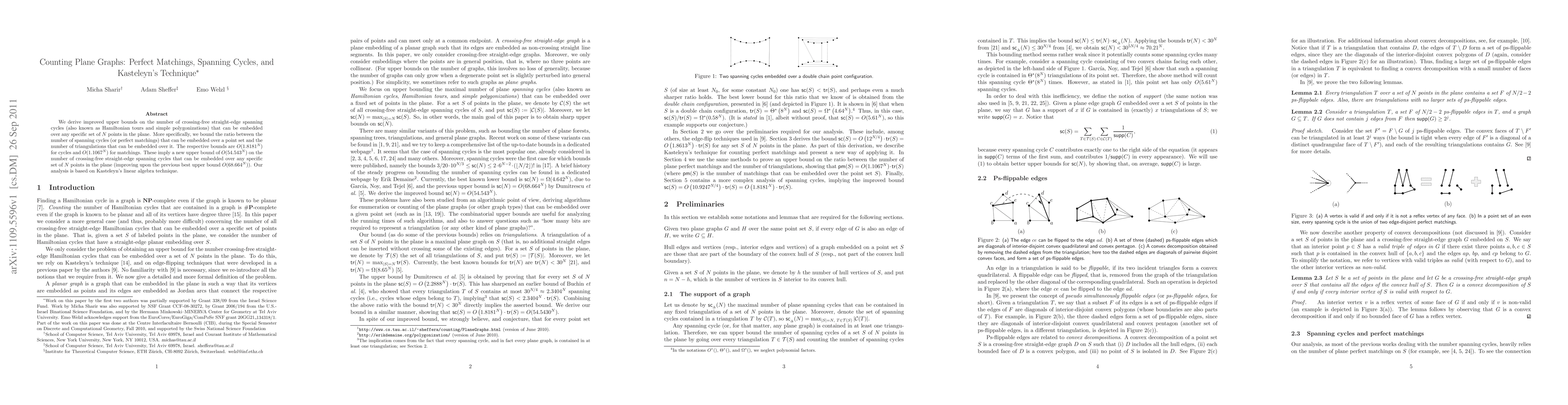 This paper provides improved upper bounds on the number of crossing-free spanning cycles that can be embedded over a set of $N$ points in the plane, utilizing Kasteleyn's technique. The bounds are $O(1.8181^N)$ for cycles and $O(1.1067^N)$ for matchings, leading to an overall upper bound of $O(54.543^N)$ for cycles, surpassing the previous best bound of $O(68.664^N)$.