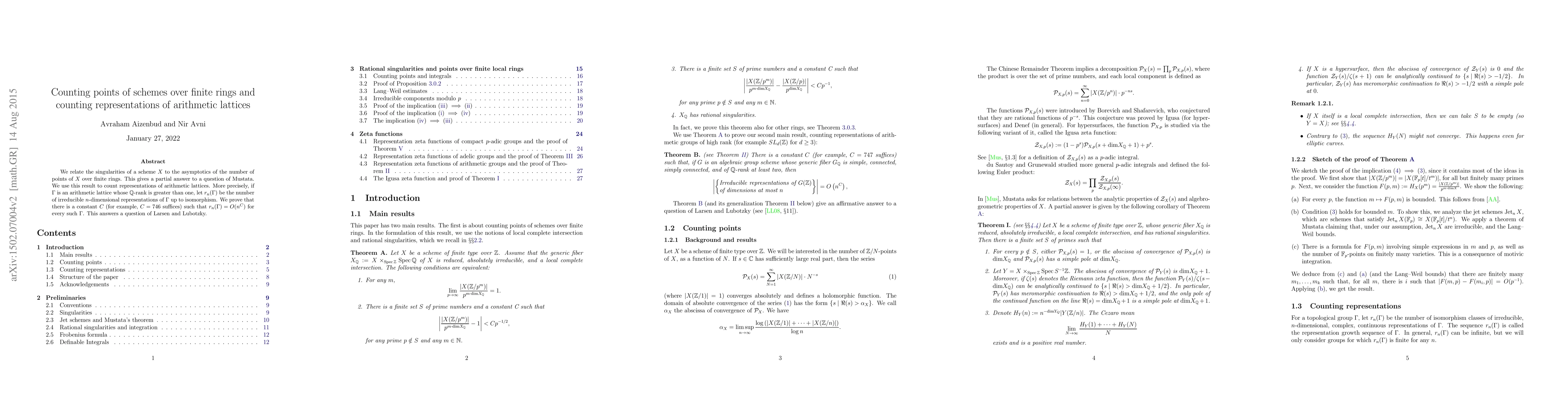 The paper relates scheme singularities to point counts over finite rings, providing a partial answer to Mustata's question, and establishes a bound on the number of irreducible representations of arithmetic lattices.